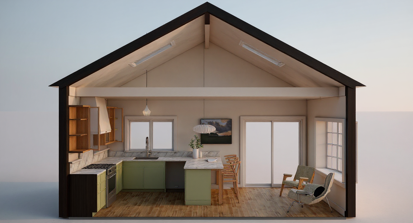 mountain modern home in a neighborhood with pine trees and aspen trees natural looking landscaping warm lighting dark wood siding grey brown stone veneer accents on fireplace and wainscot black window frames black standing seam metal roofing architecture