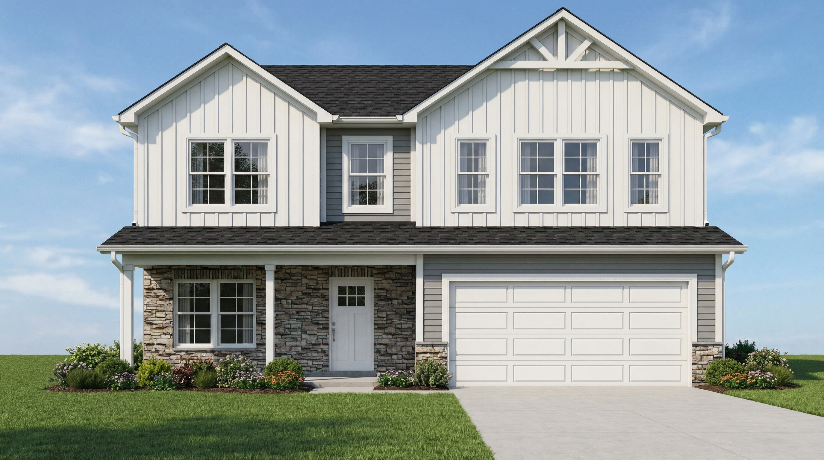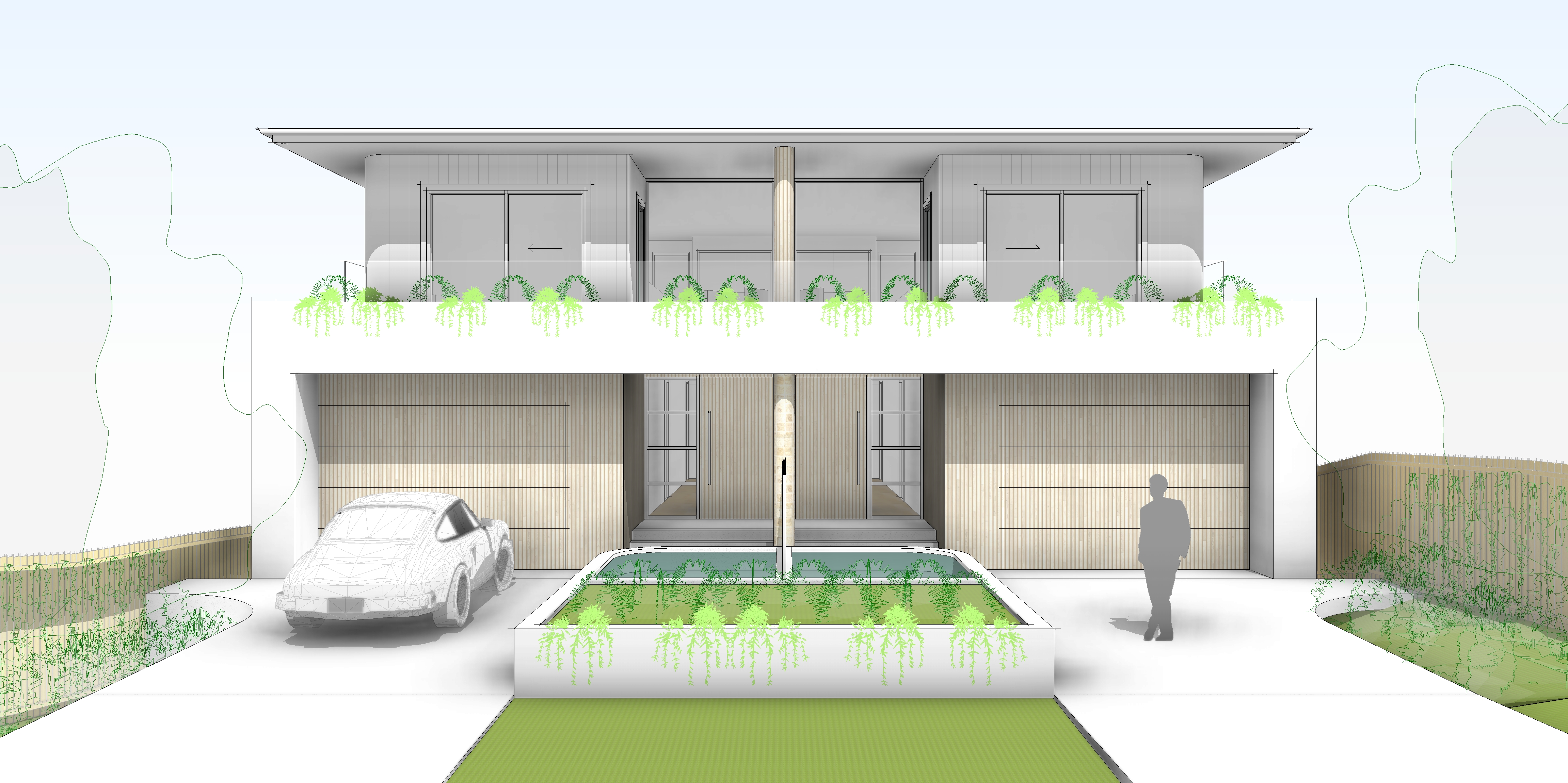 render a photorealistic 3d perspective of this house near sydney reference the current material style and enhance them white metal roof linea fibre cement cladding and sandstone walls keep model geometry the same windows doors roof walls garage door pavement driveway make a lush vegetation that looks native to australia do not change the view only enhance the current materials and make the landscape nicer vegetation detailed textures in the grass and glass reflections and a vibrant clear sky with light atmospheric depth render in hyper realistic architectural visualization quality 8k resolution