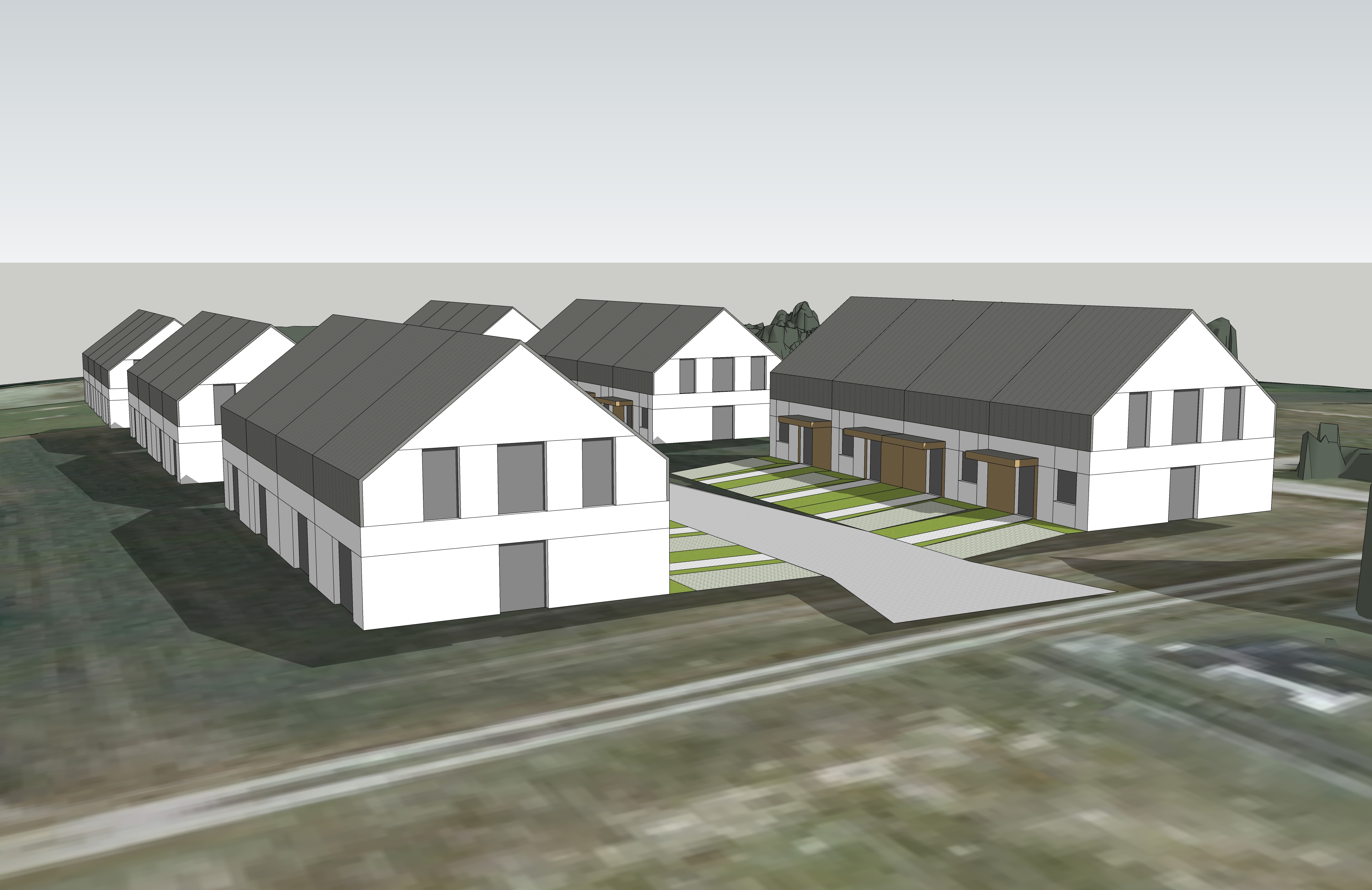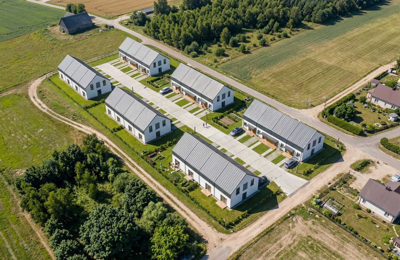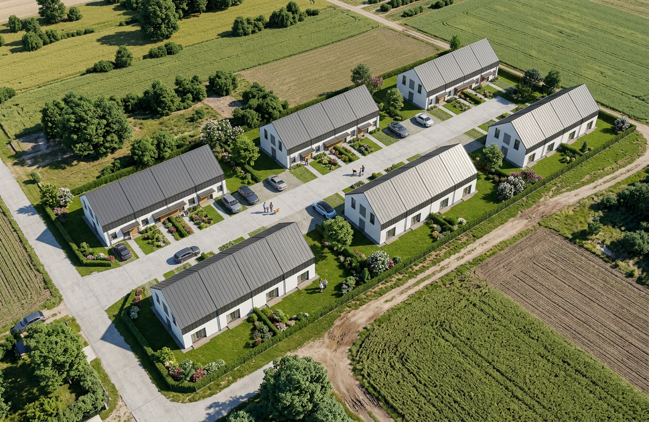 high resolution aerial view of a modern housing estate embedded in a rural landscape from google maps featuring 10 identical minimalist houses with steep gabled metal roofs in dark gray white and light gray facade panels narrow vertical windows and small front porches houses arranged in two parallel rows of 5 connected by a central concrete pathway with green strips and small gardens between them surround with lush green fields trees hedges and distant forested areas for natural context photorealistic rendering sunny day with clear sky detailed textures on buildings and landscape high detail 4k quality no distortions roof metal panel cladding walls white plaster grey on walls windows locations add cars people some extra trees and shrubs internal road concrete pavement
