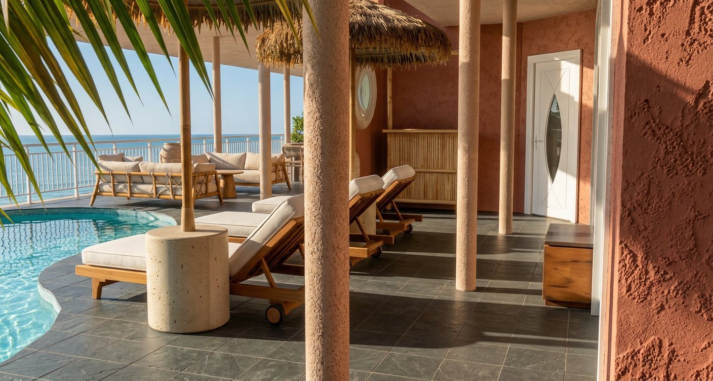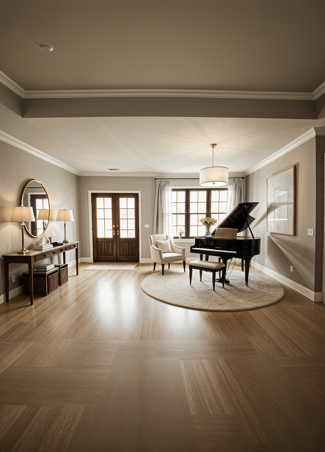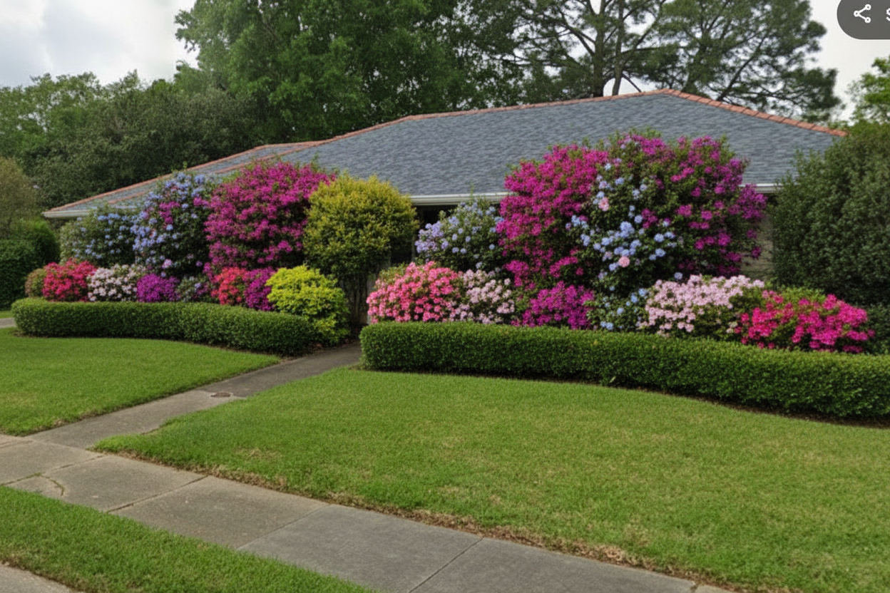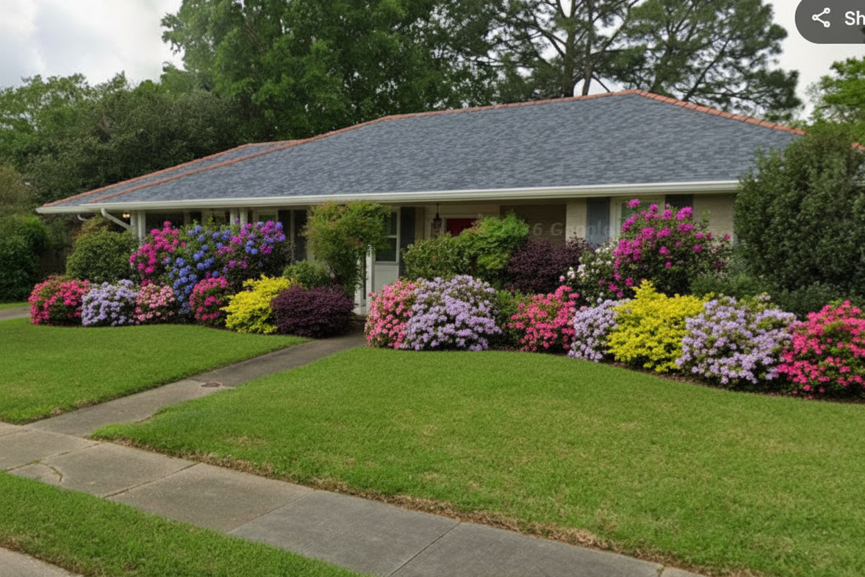 high resolution aerial view of a modern housing estate embedded in a rural landscape from google maps featuring 10 identical minimalist houses with steep gabled metal roofs in dark gray white and light gray facade panels narrow vertical windows and small front porches houses arranged in two parallel rows of 5 connected by a central concrete pathway with green strips and small gardens between them surround with lush green fields trees hedges and distant forested areas for natural context photorealistic rendering sunny day with clear sky detailed textures on buildings and landscape high detail 4k quality no distortions roof metal panel cladding walls white plaster grey on walls windows locations add cars people some extra trees and shrubs internal road concrete pavement