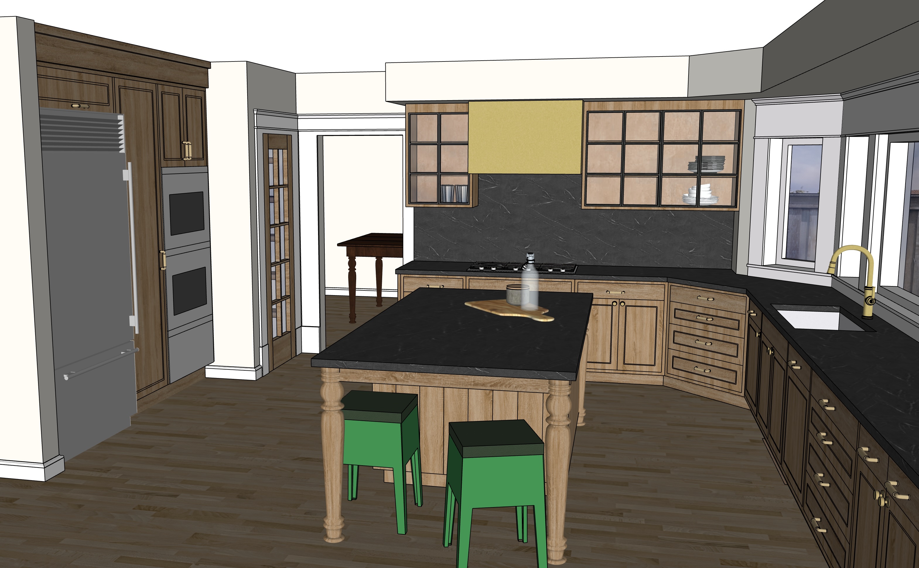 render this image as photo realisitic do not add anything to the room do not put anything in the cabinets the floors and countertops should be matte the range hood cabinet handles and faucet should have a rich brushed brass finish