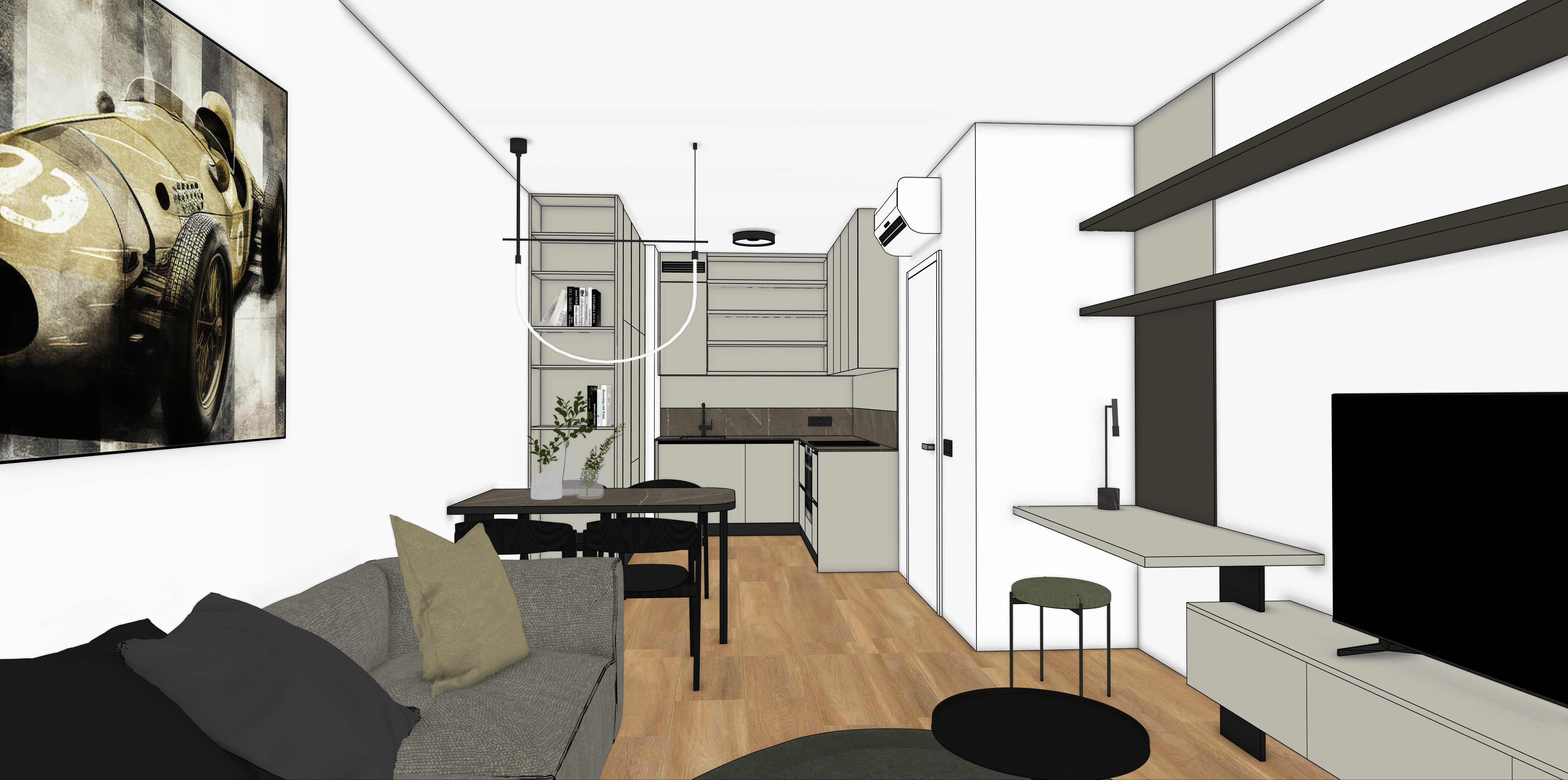 render a modern and elegant interior space featuring a compact kitchen and dining area use neutral tones with light beige cabinets and walls complemented by black accents on chairs and fixtures the wooden floor should have a natural light oak color enhancing the warmth of the space include a light gray sofa to add a cozy touch create a minimalist atmosphere with soft natural lighting to emphasize clarity and simplicity ensuring a harmonious and stylish environment