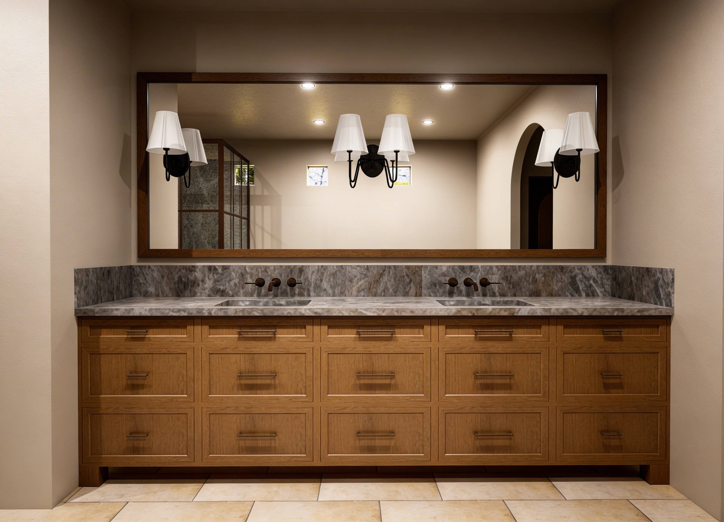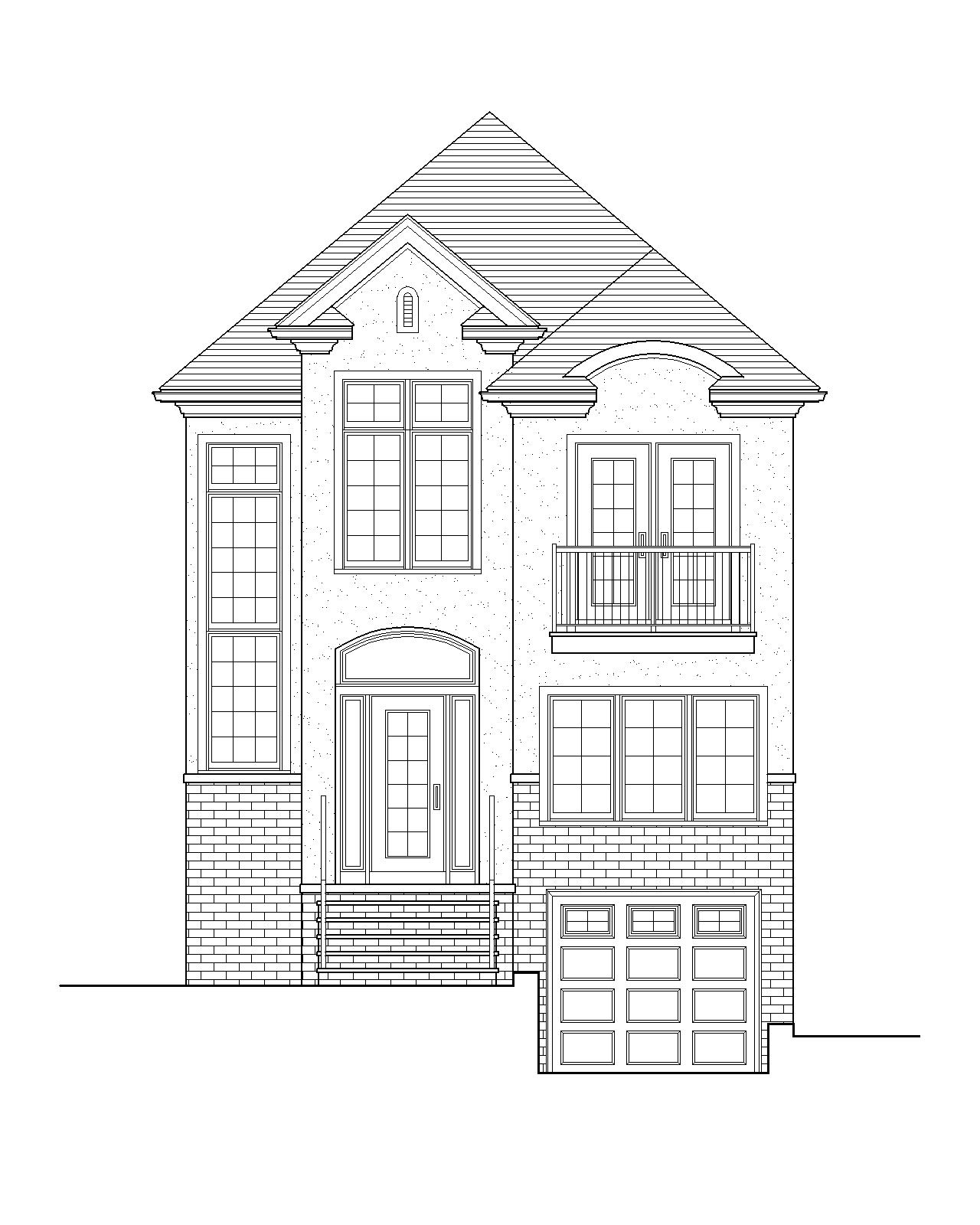 render this elevation realistic in a setting with some light landscaping in a residential neighborhood the windows and doors should be black the brick should be a natural color and stucco should be in a light modern color