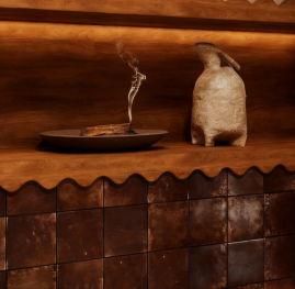 buat itu menjadi backdrop wall bar tapi tambahin bentuk unyx yang simple tp jangan formal tapi elegan jgn organis bgt jgn kek lempelan harus menyatu dengan bentuk lain atau bentuknya agak triangle dan trapesium ya unixny tp hrs masuk ke dinding jd jgn full semua onix sederhana tp nice itu udah bagus coba wide dikitttt bgt viewnya ilangin counter barnya