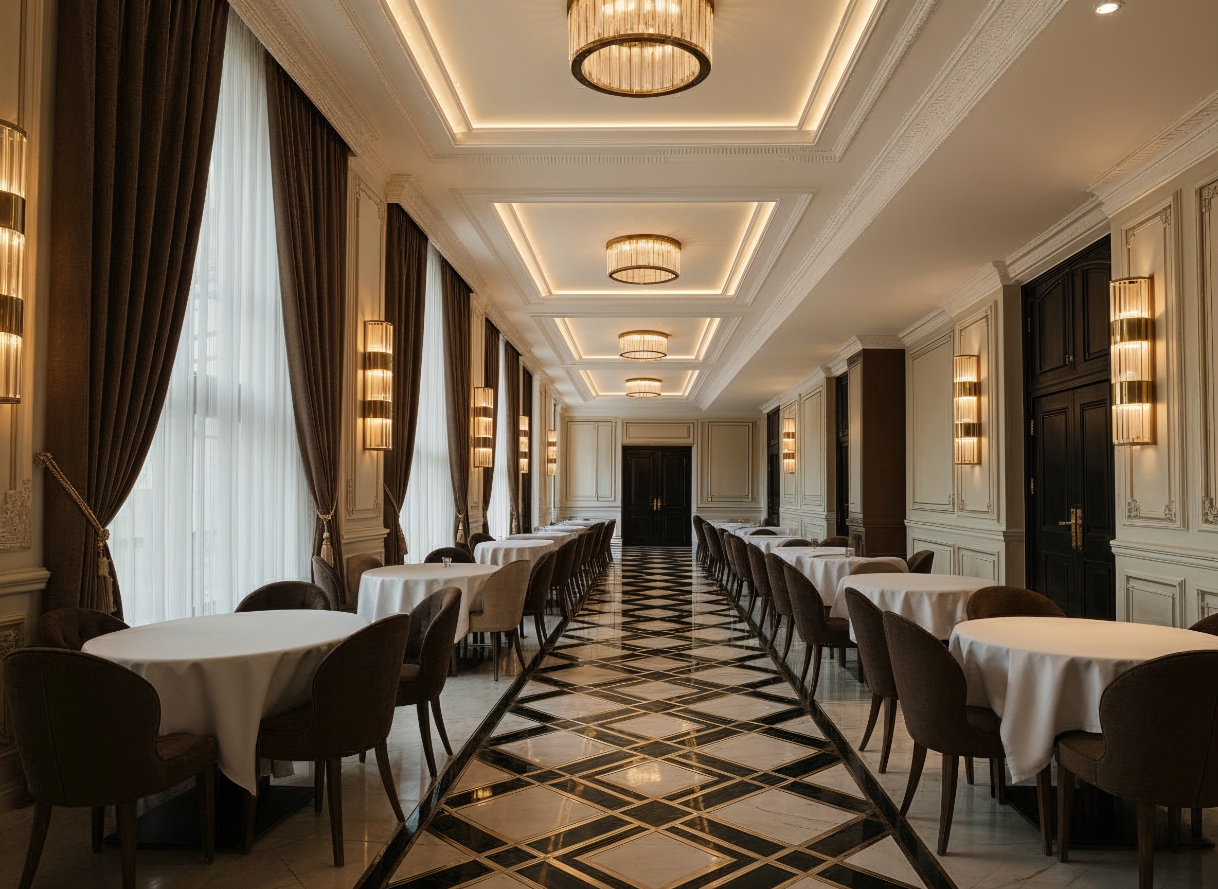 enhance the existing hotel restaurant scene with ultra photorealistic detail sharpening textures materials and lighting while preserving the entire room layout furniture lighting windows and architectural scale exactly as they are moldings and trimmings refine all wall paneling cornices and decorative trims to be strictly geometric linear and symmetrical with clean angles and intersections remove any floral organic or round motifs emphasizing a modern precise neoclassical aesthetic preserve original proportions and alignment staging additions elegantly enhance the scene with subtle high end details such as candles vases artwork table accessories or small decorative objects while keeping all furniture and circulation paths intact add life and richness without altering any existing elements maintain warm cinematic lighting polished reflections and depth emphasizing luxurious materiality and architectural clarity ensure that all additions are coherent with the room s formal grand and symmetrical composition enhancing atmosphere and elegance without changing any original geometry or layout