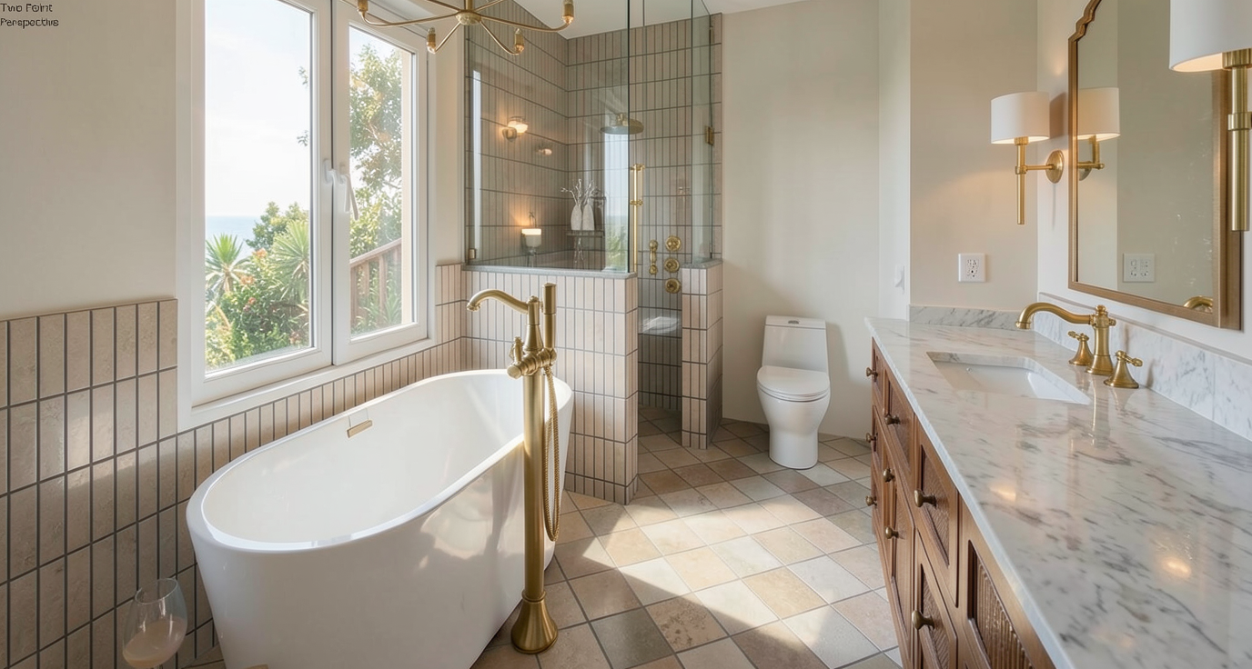 a high end architectural digest style interior photograph of a luxury powder room with a quiet luxury aesthetic the space feels refined minimal and materially rich with a cohesive warm neutral palette and strong architectural clarity shot on a 24 28mm full frame lens at eye level with subtle asymmetrical composition and professional interior editorial framing the lighting is a bright layered architectural digest daytime editorial lighting scheme with soft contrast natural depth and realistic material response primary lighting is soft diffused natural daylight from an unseen source large window or skylight off frame the daylight is evenly distributed but not flat creating gentle shadows that preserve depth and dimensionality across all surfaces the overall exposure is bright clean and airy while maintaining texture secondary lighting is a warm architectural wall sconce on the left 2700k mounted on the bianco antico tile wall it acts as a soft accent light only gently grazing the surface to emphasize texture without dominating the daylight additional invisible ceiling integrated ambient fill lighting very low intensity neutral warm tone ensures all corners remain softly visible with no crushed blacks or overly dark areas this keeps the space readable while preserving natural contrast a subtle under vanity led glow 2700 3000k very soft intensity creates a floating effect and gently illuminates the white oak floor adding depth and architectural separation the floating vanity is clad in green oasis marble with dramatic emerald and white veining bookmatched and highly polished it is evenly lit by the ambient daylight allowing full visibility of the stone pattern with soft natural highlights and no overexposed hotspots above the vanity is a tall borderless vertical mirror mounted flush with no visible hardware it reflects soft daylight and subtle shadow gradients realistically with controlled exposure and no blown highlights to the left a feature wall of arto timeworn 1x4 mesh tiles in bianco antico installed in perfect vertical straight set alignment the surface is matte slightly imperfect and softly textured with daylight grazing revealing fine surface variation mounted on the tile wall is a stephane parmentier ida wall sconce in aged bronze emitting a warm soft directional glow that blends naturally into the daylight environment a modern column faucet in aged bronze descends from the ceiling positioned precisely over the sink basin it is sculptural and minimal with soft highlights catching its edges a single knurled bronze control knob is wall mounted near the sink understated and minimal matching all other bronze finishes in the space the surrounding walls are finished in portola paints roman clay brooks a creamy white plaster with subtle trowel movement soft irregular texture and natural tonal variation the plaster gently diffuses daylight throughout the space the flooring is wide plank natural white oak with a matte oil finish showing soft grain variation and warm undertones light reflects subtly without gloss or glare the interior door is finished in matching natural white oak veneer using the same species and tone as the flooring for material continuity the grain direction differs slightly from the floor to define it as a separate architectural element the finish is matte and low sheen with soft natural texture minimal brushed bronze hardware matches the rest of the fixtures lighting behavior is bright soft and editorial with controlled contrast dominant diffused daylight gentle warm accent lighting soft shadow transitions and physically accurate global illumination no dark corners no crushed blacks no overexposure and no flat cgi lighting ultra realistic v ray corona renderer quality physically based rendering high end architectural digest editorial photography style 8k resolution subtle imperfections in plaster reflections and marble veining for realism
