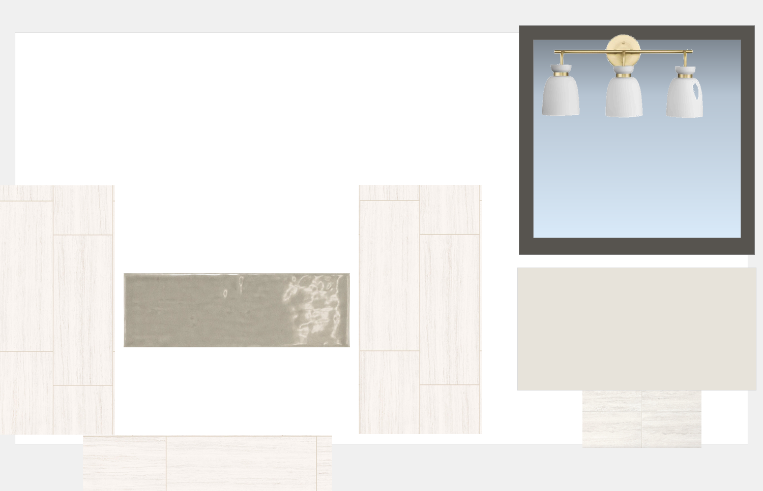 medium grey color tile is the main wall in the alcove style tub the beige tile goes on the floor and side walls of the tub alcove the large cream color is the wall color add cabinet doors use brushed gold plumbing fixtures no windows put a toilet in the space this bathroom is not large the dark color is the mirror trim surround and cream cabinet color