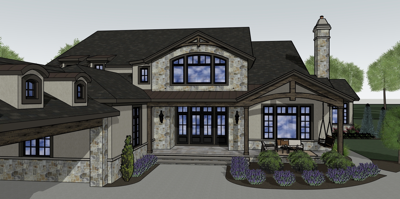 partly cloudy sky deciduous trees in background bronze trim paved concrete driveway add gutters and downspouts