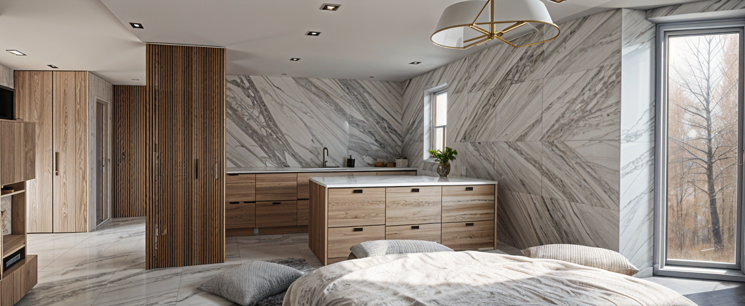 modernist exterior shot render this kitchen into a classic design with a classic wallpaper on the wall together with rich wood wall and the wood fronts in the kitchen architecture