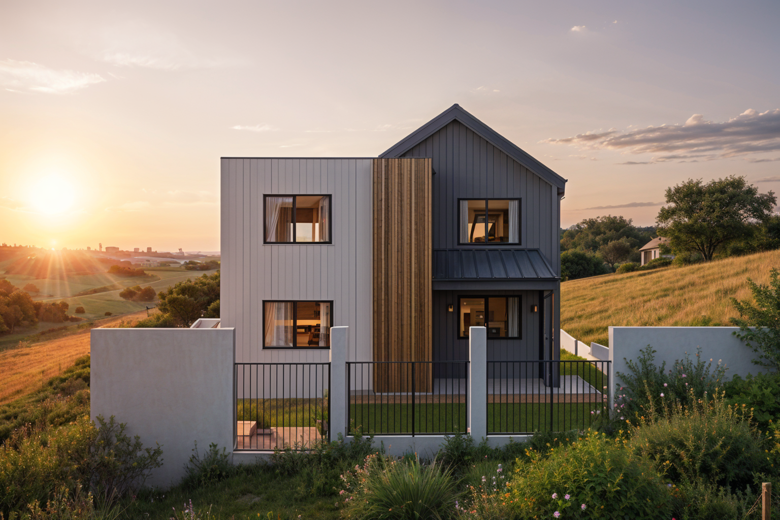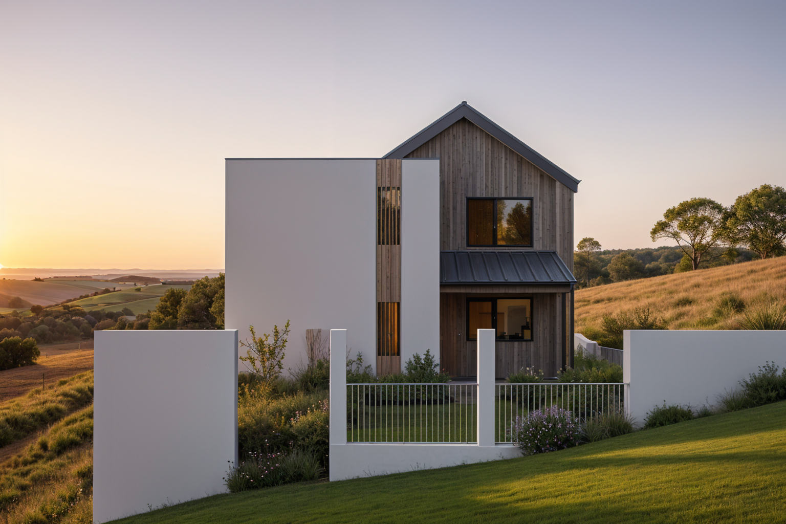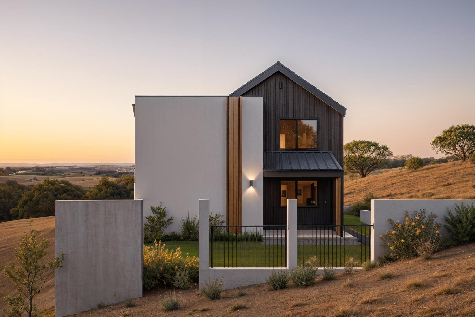 modernist exterior shot on a steep wooded hill tall trees surrounding house shou sugi ban architecture