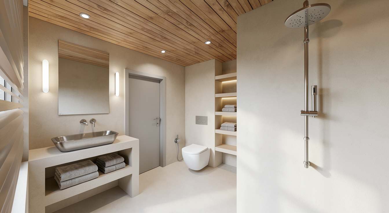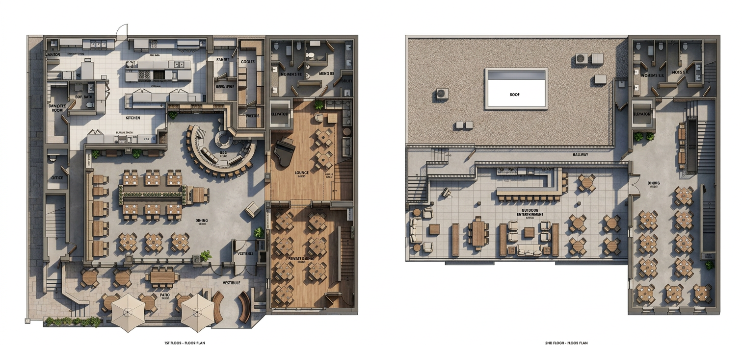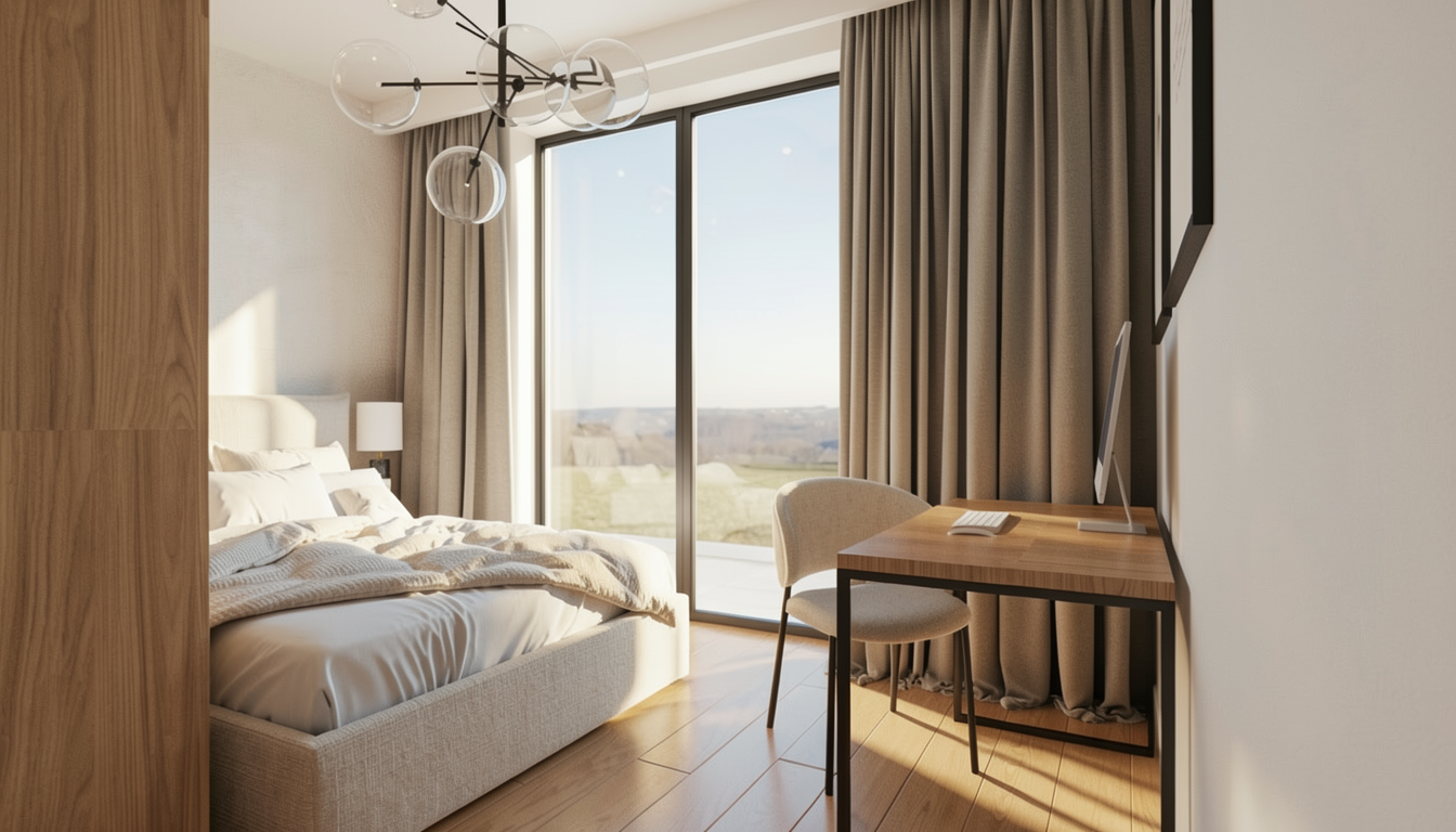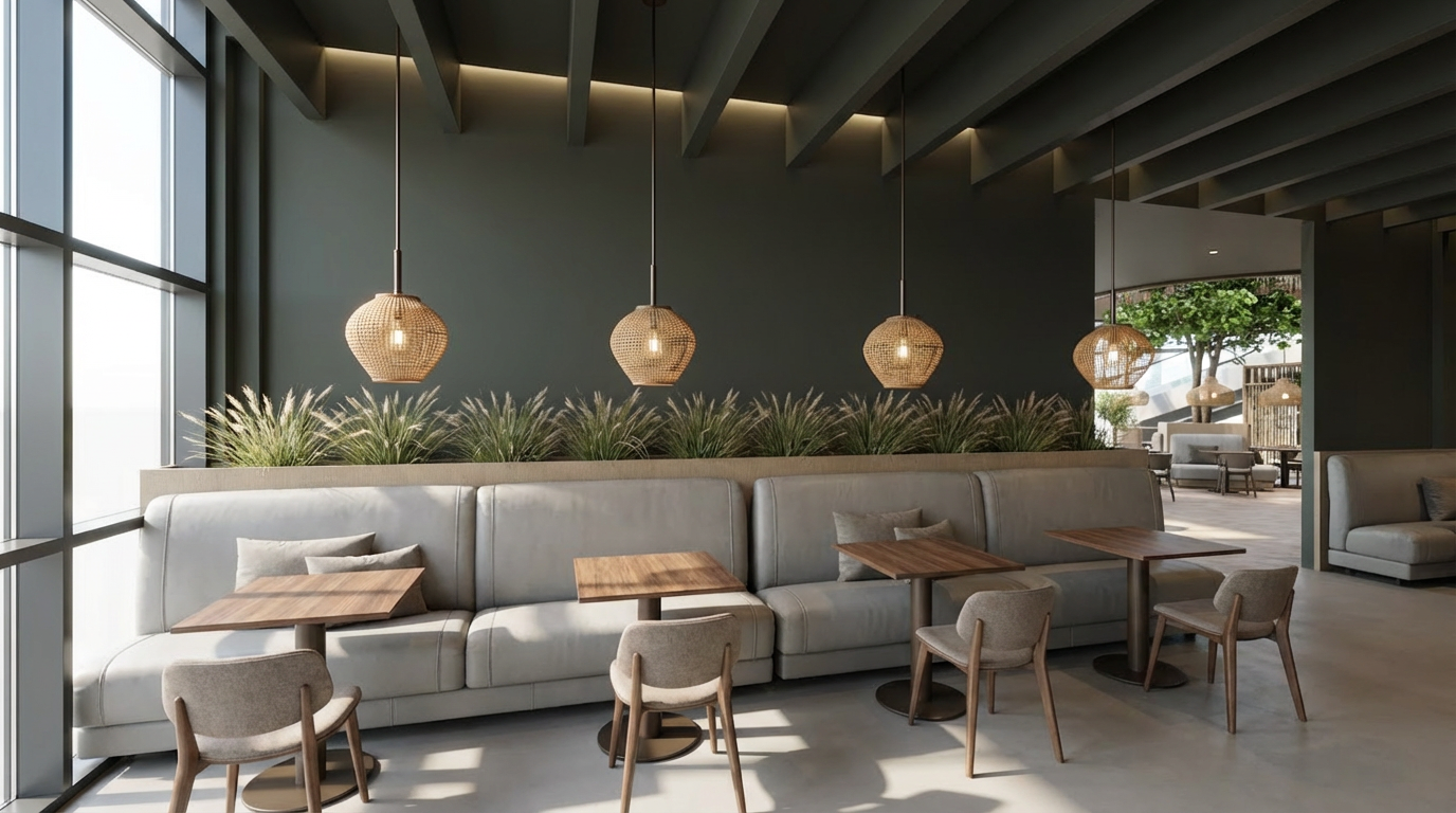 a photorealistic high resolution interior photograph captured in natural bright daylight based strictly on the layout and composition of the current view the perspective is maintained with natural daylight flooding in from the left grid glass partition creating a clean crisp and fresh daytime atmosphere there are no changes allowed to the design or proportions of the current composition furniture long booth background the long contiguous straight bench is upholstered in full grain light grey leather dux vintage fr light grey with a clean smooth finish clearly visible as leather the leather must be distinct and light grey not dark distressed or fabric with detailed texture definition and sharply defined segmentation and seams two black pillows remain tables and chairs four chairs with walnut frames are upholstered in smooth neutral taupe wool felt canyon 0967 0025 taupe they are placed at four small walnut topped tables on pedestals as shown built in elements the integrated planter box directly behind the bench is covered in a textile look wood laminate decolegno alpaca fd32 in a clear camel beige tone filled with feathery grasses clearly visible in daylight walls ceilings structure main walls finished in a smooth matte coat of complex dark charcoal green paint little greene attic 2 but appearing distinctly brightened by daylight ceiling beams the exposed beams and the rest of the ceiling are also finished in little greene attic 2 glass partition left the large gridded glass partition is clear providing the main light source background vista the view through the open doorway on the right reveals the beyond area with the tree and complex seating rendered in the same bright daylight style lighting the pendant light locations are rendered as realistic rookglas smoke glass pendant lamps suspended by bronze rods these lamps show a warm glowing light source within the translucent glass with subtle reflections flooring the entire floor in the background within the doorkijkruimte features a detailed patterned terrazzo surface with black white and earthy fragments consistent with the style from previous views rendered with realistic reflections refinement focus on accurate daylight interaction sharp texture definition for all materials especially the smooth light grey leather and realistic reflections in the smoke glass and terrazzo natural daylight from the left must be dominant strict directive render the scene exactly as shown preserving all proportions and design elements but with a bright daytime atmosphere and photorealistic materiality and lighting omit all plants except the grasses