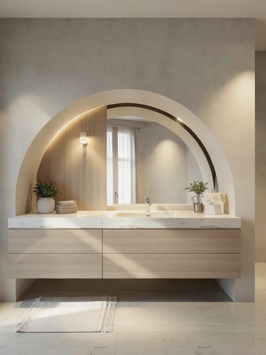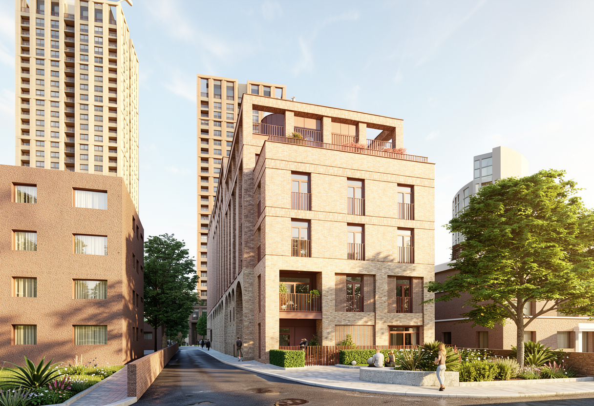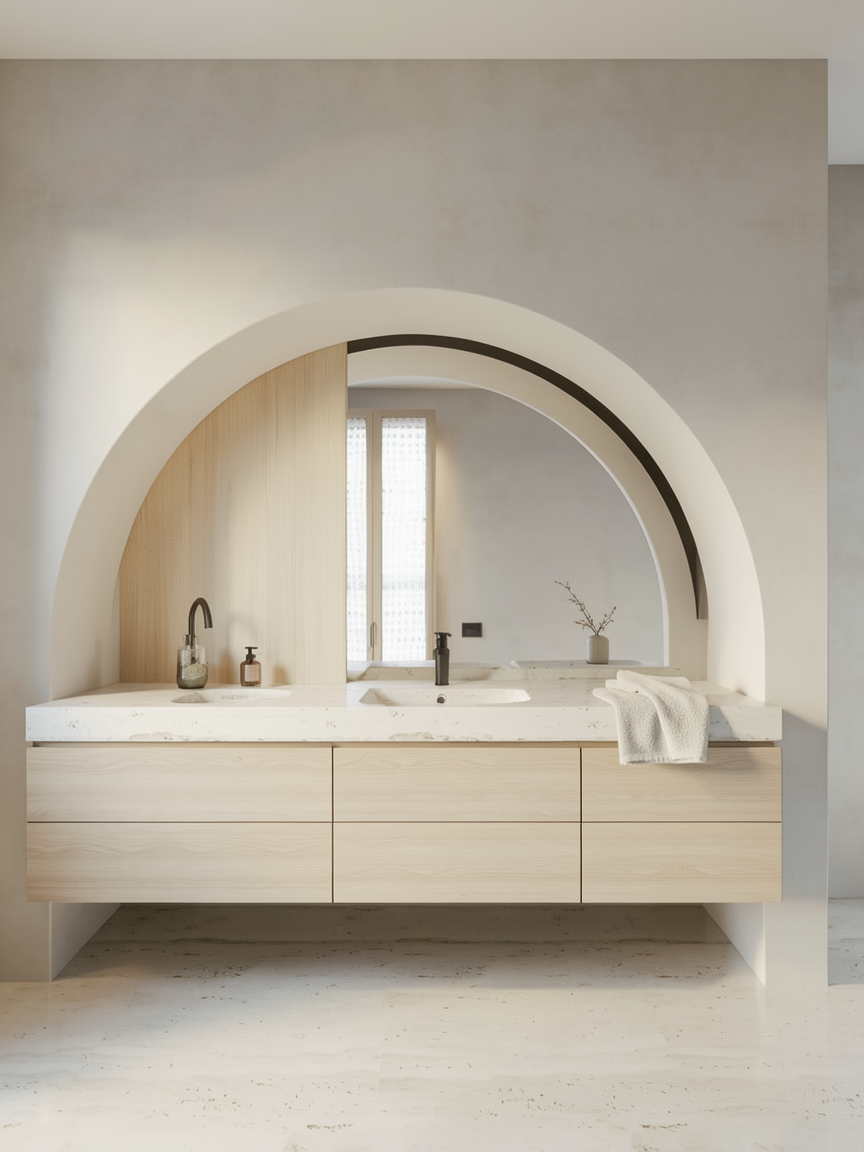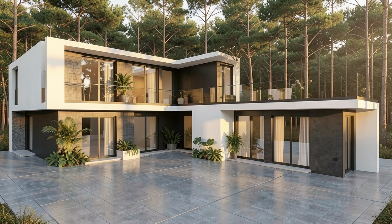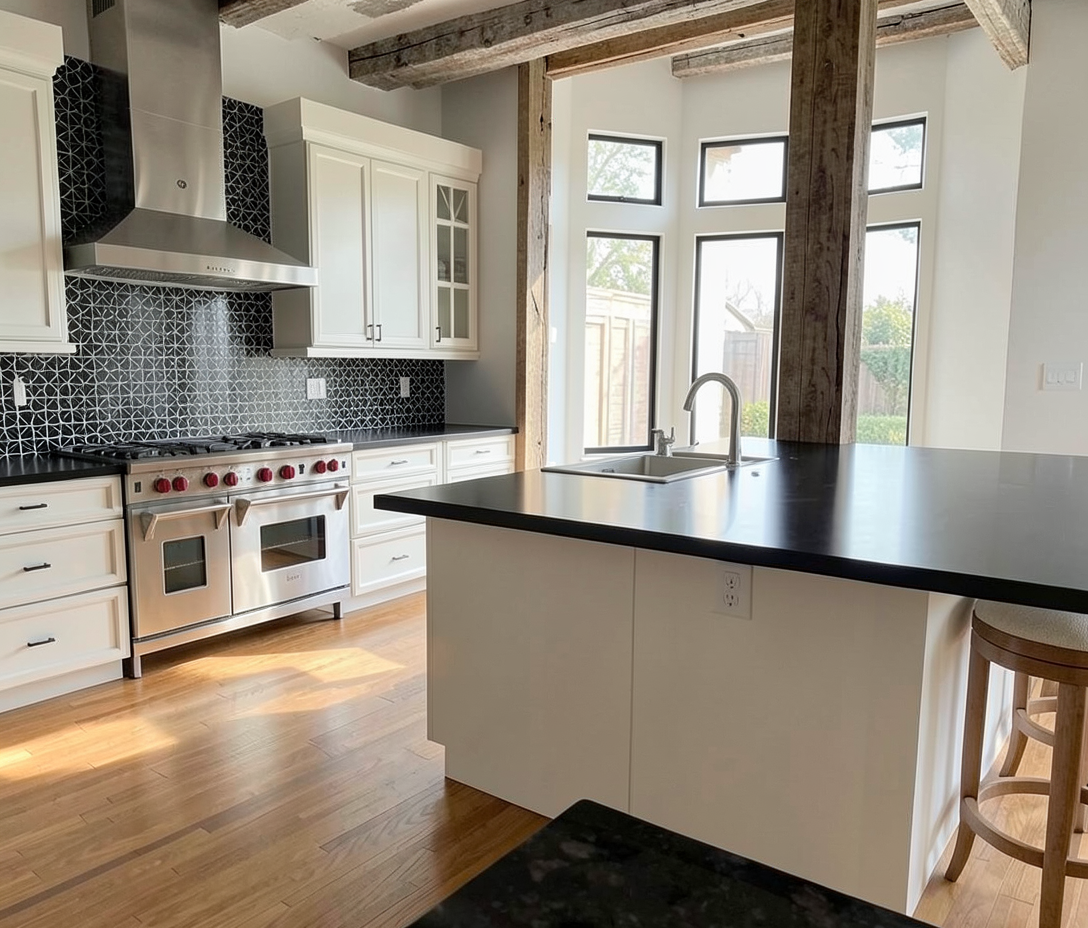 a photorealistic high resolution interior photograph captured in natural bright daylight based strictly on the layout and composition of the current view the perspective is maintained with natural daylight flooding in from the left grid glass partition creating a clean crisp and fresh daytime atmosphere there are no changes allowed to the design or proportions of the current composition furniture long booth background the long contiguous straight bench is upholstered in full grain light grey leather dux vintage fr light grey with a clean smooth finish clearly visible as leather the leather must be distinct and light grey not dark distressed or fabric with detailed texture definition and sharply defined segmentation and seams two black pillows remain tables and chairs four chairs with walnut frames are upholstered in smooth neutral taupe wool felt canyon 0967 0025 taupe they are placed at four small walnut topped tables on pedestals as shown built in elements the integrated planter box directly behind the bench is covered in a textile look wood laminate decolegno alpaca fd32 in a clear camel beige tone filled with feathery grasses clearly visible in daylight walls ceilings structure main walls finished in a smooth matte coat of complex dark charcoal green paint little greene attic 2 but appearing distinctly brightened by daylight ceiling beams the exposed beams and the rest of the ceiling are also finished in little greene attic 2 glass partition left the large gridded glass partition is clear providing the main light source background vista the view through the open doorway on the right reveals the beyond area with the tree and complex seating rendered in the same bright daylight style lighting the pendant light locations are rendered as realistic rookglas smoke glass pendant lamps suspended by bronze rods these lamps show a warm glowing light source within the translucent glass with subtle reflections flooring the entire floor in the background within the doorkijkruimte features a detailed patterned terrazzo surface with black white and earthy fragments consistent with the style from previous views rendered with realistic reflections refinement focus on accurate daylight interaction sharp texture definition for all materials especially the smooth light grey leather and realistic reflections in the smoke glass and terrazzo natural daylight from the left must be dominant strict directive render the scene exactly as shown preserving all proportions and design elements but with a bright daytime atmosphere and photorealistic materiality and lighting omit all plants except the grasses