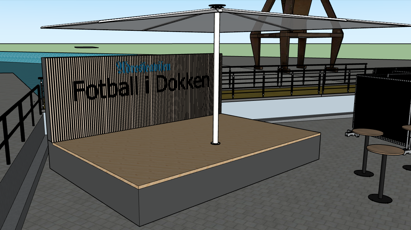 a highly realistic outdoor event stage at a waterfront dock in trondheim norway the stage is 6 meters wide and 4 meters deep raised 40 50 cm above ground the stage floor is dark anthracite matte or satin finish clean professional event stage surface not glossy at the back is a wall approximately 2 meters high consisting of two connected wall sections forming a slight angle the wall is covered with a premium wooden slat design spilevegg narrow vertical slats 20 30 mm width with 10 15 mm gaps evenly spaced light natural wood tone clean scandinavian finish add large cnc cut metal letters spelling exactly fotball i dokken the letters are 52 cm tall matte black metal slightly bold thick typography clean and modern they are mounted 50 mm off the wall position the text slightly left of center so the parasol pole does not intersect the words add warm white led halo lighting around 3000k behind each individual letter the glow must be tight controlled and close to the letters not spreading widely the lighting intensity is subtle reduced by about 20 even per letter with slight natural variation and soft shadows between the slats above the main text add the adressa newspaper logo as cnc cut metal letters approximately 37 40 cm tall slightly increase its size and contrast so it is clearly readable mounted closer to the wall 20 30 mm offset with no lighting in the center of the stage stands a large white parasol with a vertical pole kept realistic but not blocking the main text surroundings waterfront dock metal railings concrete surfaces realistic outdoor environment scandinavian minimalistic design clean and premium soft overcast daylight realistic shadows high detail high realism no people no clutter ensure correct spelling and clean typography no distortions