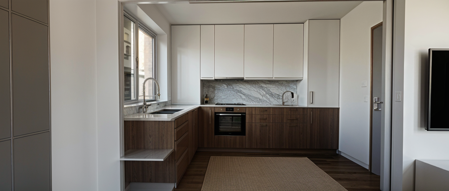 the ceiling features light gray wooden beams and the walls are adorned with subtle white patterned wallpaper the floor is a light brown wood adding warmth to the space position a beige sectional sofa in the center complemented by a gray throw blanket a modern dark wood coffee table is set on a textured light gray rug include a few lush green indoor plants for a touch of nature on one side place a sleek wooden desk with a contemporary black and gold desk lamp and an open laptop accent the walls with a set of black and white framed photographs providing a minimalist aesthetic add large geometric black pendant lights hanging from the ceiling creating a focal point the atmosphere should feel cozy and inviting perfect for relaxation and creativity brighten up the scene
