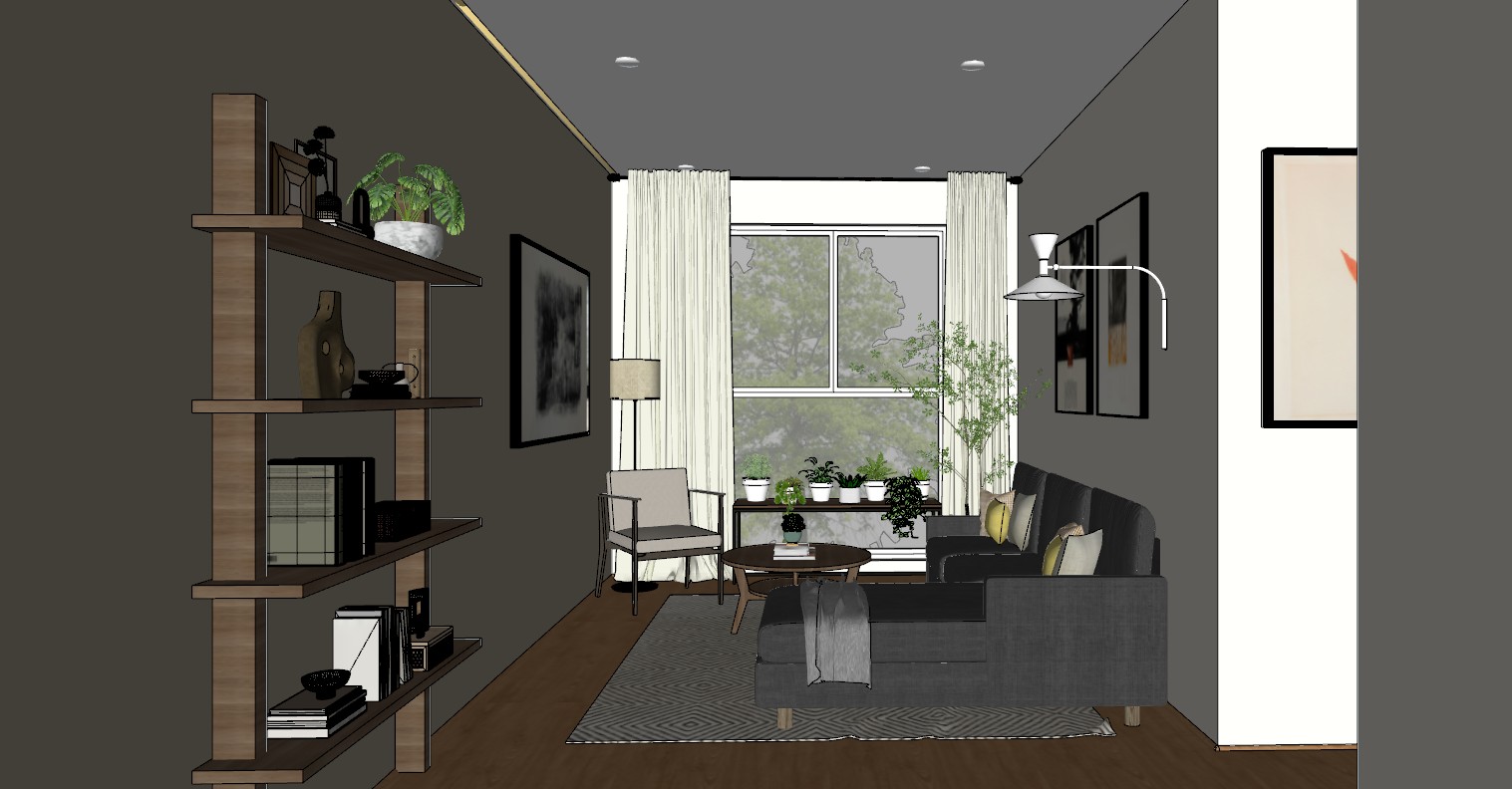 photorealistic interior render of a small contemporary living room strictly preserving the original architectural model proportions layout and furniture placement the scene features an l shaped sofa upholstered in oxford gray fabric deep slightly cool toned dark gray with visible fine textile texture decorated with neutral cushions in gray beige and subtle olive green accents a modern armchair with a thin black metal frame and light fabric upholstery is positioned adjacent to a round coffee table with a matte black metal base and dark top surface the floor is finished in ash tone natural wood fresno with realistic grain patterns and a semi matte finish wall color distribution is clearly defined the left wall is a softened warm brown tone coffee like slightly desaturated and lighter than a typical dark brown but clearly distinct from beige with a matte finish and subtle microtexture the back wall window wall is a slightly lighter warm brown tone the right side walls are light soft beige tones creating contrast and depth while maintaining a cohesive warm palette a large window with white framing is centered at the back wall with slightly reflective glass and sheer white linen curtains that softly diffuse incoming daylight there is a recessed ceiling detail cajillo with an integrated warm led strip 3000k located exclusively on the upper left side of the ceiling the led strip runs only along the left ceiling edge above the darker brown wall producing indirect ambient light that softly washes only the left wall and adjacent ceiling area strict lighting constraint there must be only one led strip in the entire scene no led strip on the back wall window side no led strip on the right side of the ceiling no perimeter lighting no continuous ceiling lighting no symmetrical lighting no led wrapping around corners no additional hidden lighting the ceiling also includes recessed spotlights plaf n lights which must be turned on and emit a warm light 3000k subtly illuminating the space without overpowering the asymmetrical led lighting absolute restriction no integrated lighting no led strips and no light emission of any kind inside or under the wooden furniture or shelving unit on the left wall the shelves must appear completely unlit with no glow no accent lighting and no hidden light sources the lighting must remain asymmetrical and clearly localized only on the upper left side of the ceiling natural lighting is soft and diffused simulating an overcast afternoon producing smooth realistic shadows with no harsh contrast complementary artificial lighting includes a white floor lamp with a fabric shade and a white wall mounted base not black and a modern black wall mounted lamp both at 3000k subtle and secondary to the left side led decor elements include a tall indoor plant with thin branches and small green leaves minimalist wall art in black frames with grayscale compositions and a neutral textured area rug with a subtle geometric pattern all materials use high quality pbr textures fabric with visible weave and bump wood with detailed grain and roughness variation metal slightly reflective with realistic roughness and glass with accurate reflections and refractions camera set at eye level approximately 1 60 m height 35mm focal length slight depth of field focusing on the sofa and coffee table physically correct exposure and neutral white balance ultra photorealistic render global illumination enabled ray tracing accurate reflections soft ambient occlusion high quality soft shadows no overexposure no stylization no cartoon effect no exaggerated colors architectural visualization real life photography style asymmetrical lighting composition single side ceiling lighting only avoid balanced lighting