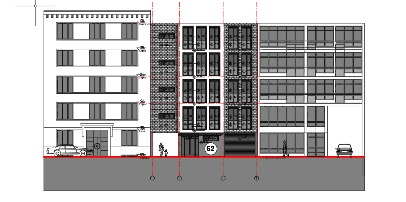 modernist exterior shot people celebrating birthday in front of building bride and groom vivid colours black colour brick walls trees on the street architecture