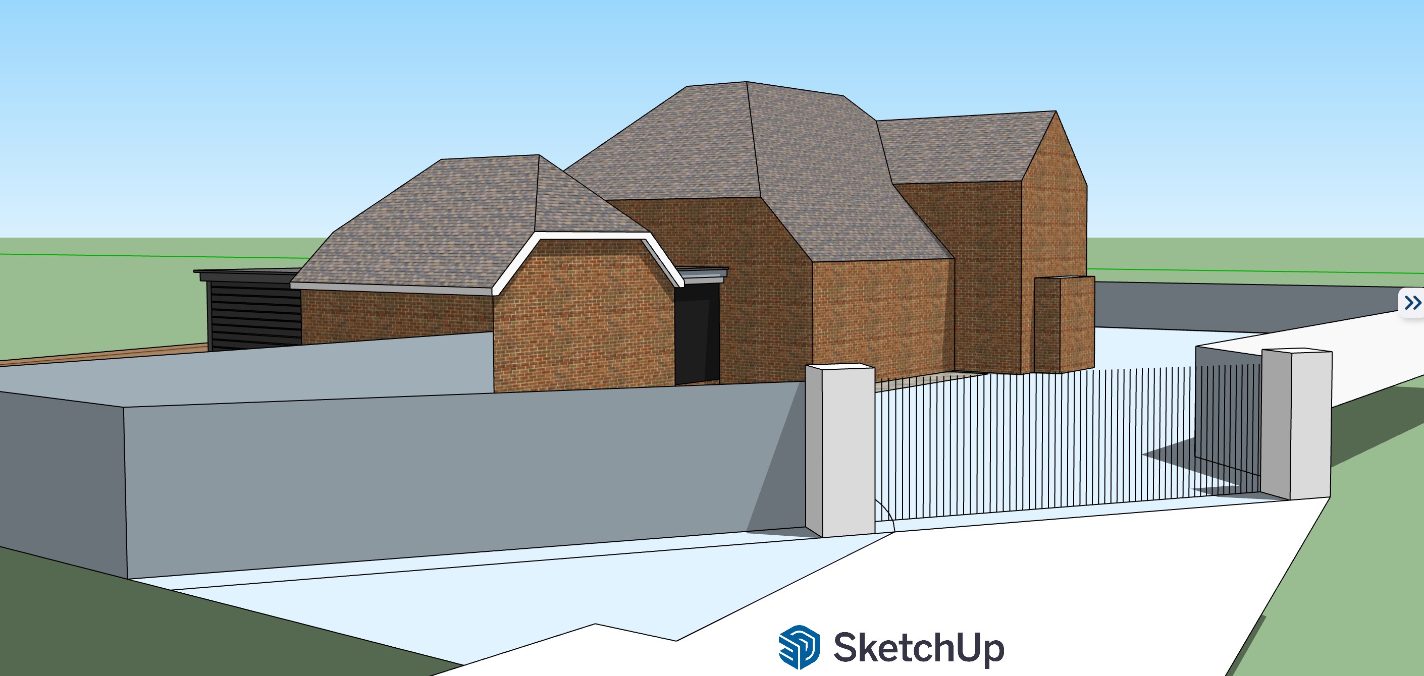 traditional brick built house with white windows show brick piers and black metal gates at front with planting