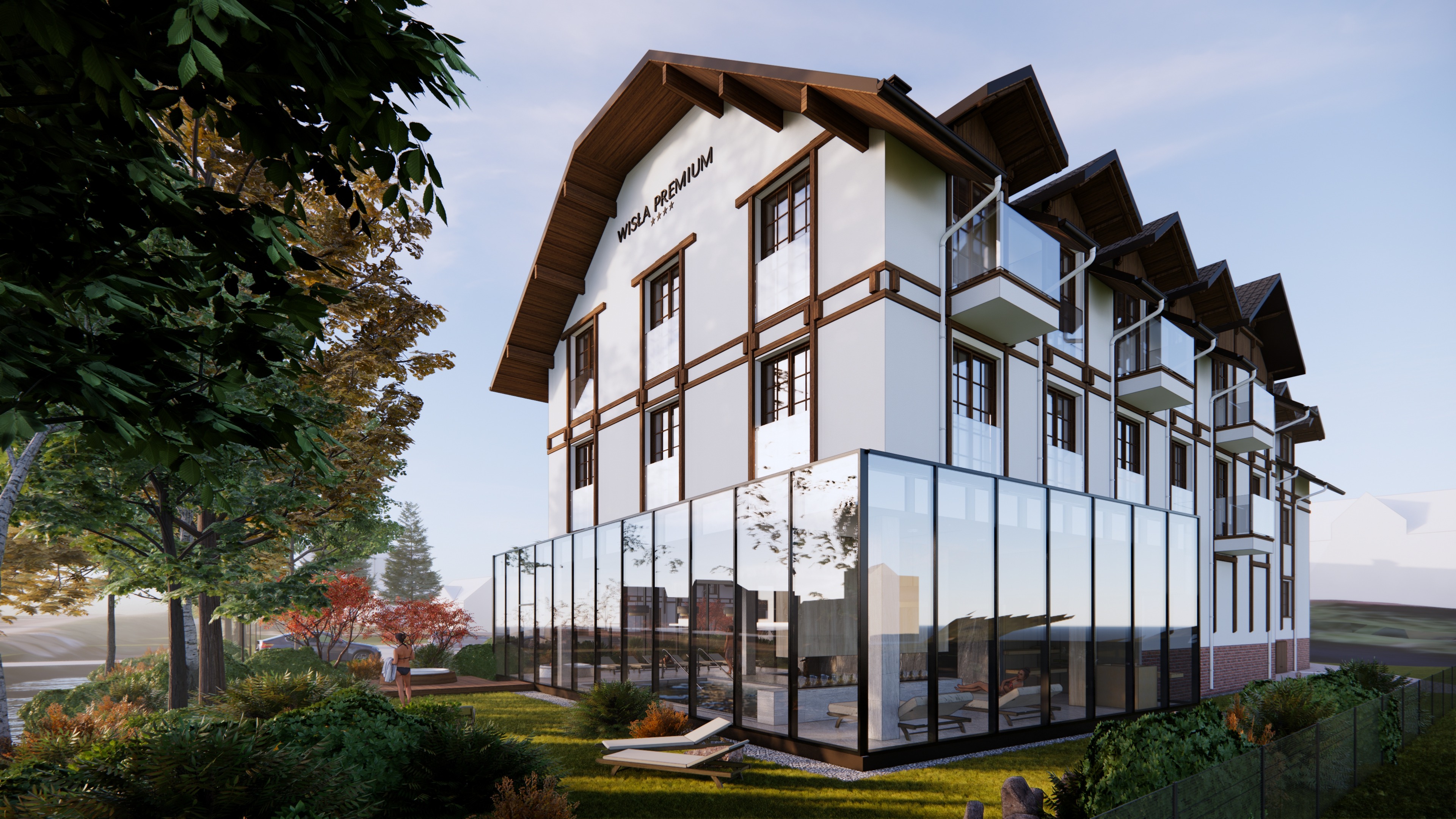 exterior shot transform this non realistic visualization into a highly photorealistic render while keeping the exact architecture proportions openings and overall composition unchanged replace all simplified or flat materials with realistic physically based ones that keep the same main color scheme but look natural and convincing matte and semi gloss paints plaster and concrete with subtle texture realistic wood with visible grain metal with soft reflections and glass with depth and transparency avoiding any plastic or cartoon look change the background environment to a realistic landscape of low mountains and surrounding forest softly shaped medium height mountains in the distance covered with mixed forest and closer background with dense trees and natural greenery all with correct scale and atmospheric perspective add a natural paved or asphalt foreground with realistic curb stones grass strips and small details like road markings or gravel transitions where appropriate add subtle natural gloss to all exterior materials according to their type with believable specular highlights and soft reflections especially on metal stone and painted surfaces enhance the windows with realistic reflections of the sky trees and surroundings in the glass while keeping interior dark enough to avoid a fake look show vertical fabric curtains inside the windows in light slightly translucent textiles hanging in soft folds partially open consistent across all glazed areas populate the scene with a few realistic contemporary cars parked or driving on the street correctly scaled to the building with detailed bodywork glass reflections and proper contact shadows on the ground optionally add a few subtle human figures in the distance for scale without drawing too much attention dressed in everyday clothes set the lighting to a bright high key daytime mood soft even daylight with minimal deep shadows bright sky high overall exposure low contrast and very light midtones like in high key architectural photography maintain crisp but soft shadows close to the building avoid dramatic contrast or dark areas and keep colors clean and slightly desaturated for a fresh airy look the final result should be ultra realistic high detail bright high key exterior architectural photography style