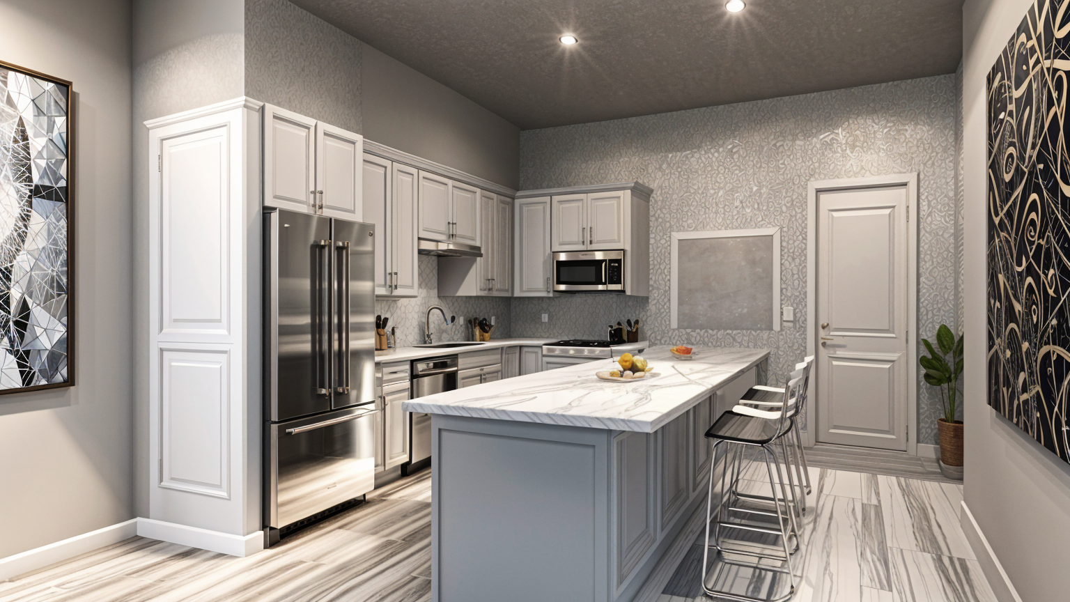 small studio kitchen with patterned backsplash grey cabinets and silver finishes walls are slight off white with white trim with soft wood flooring stainless steel refrigerator