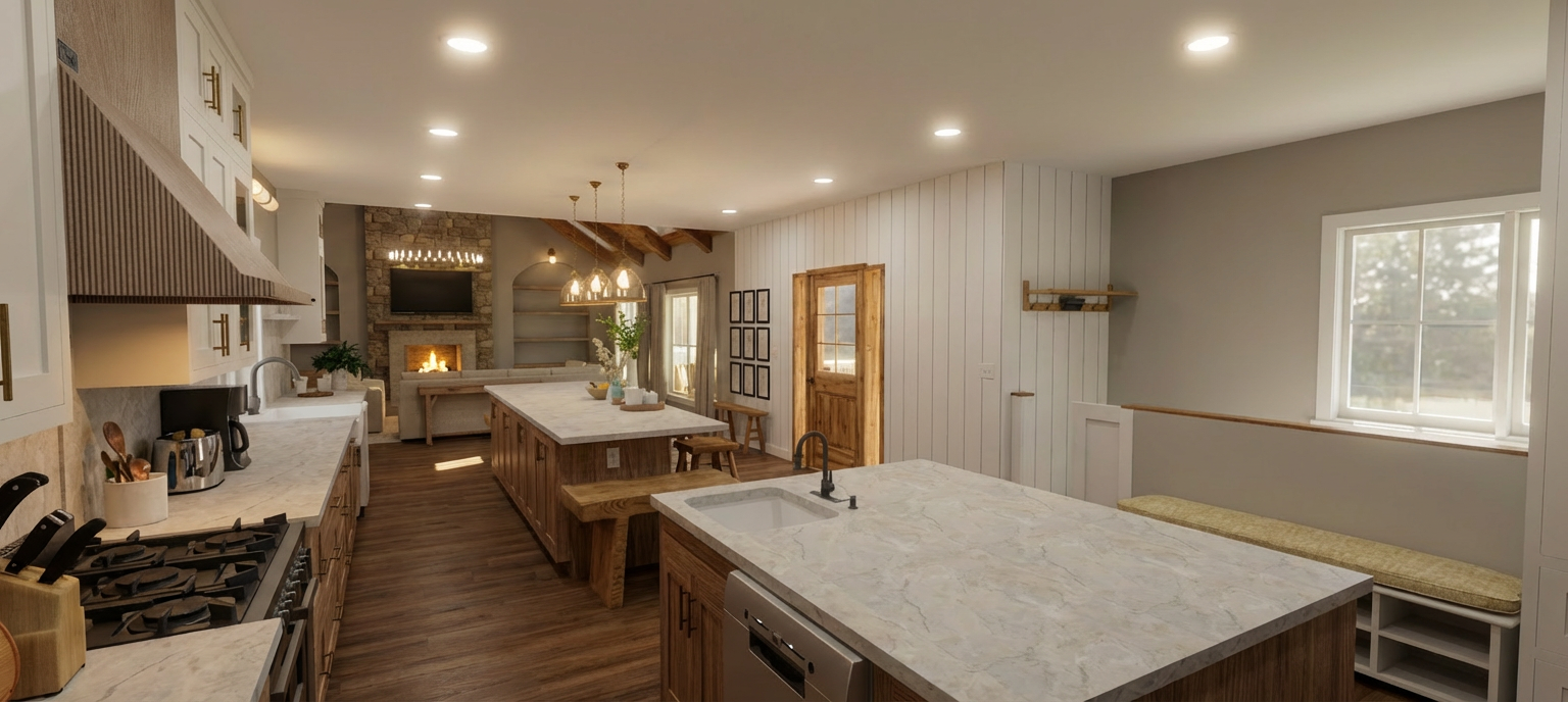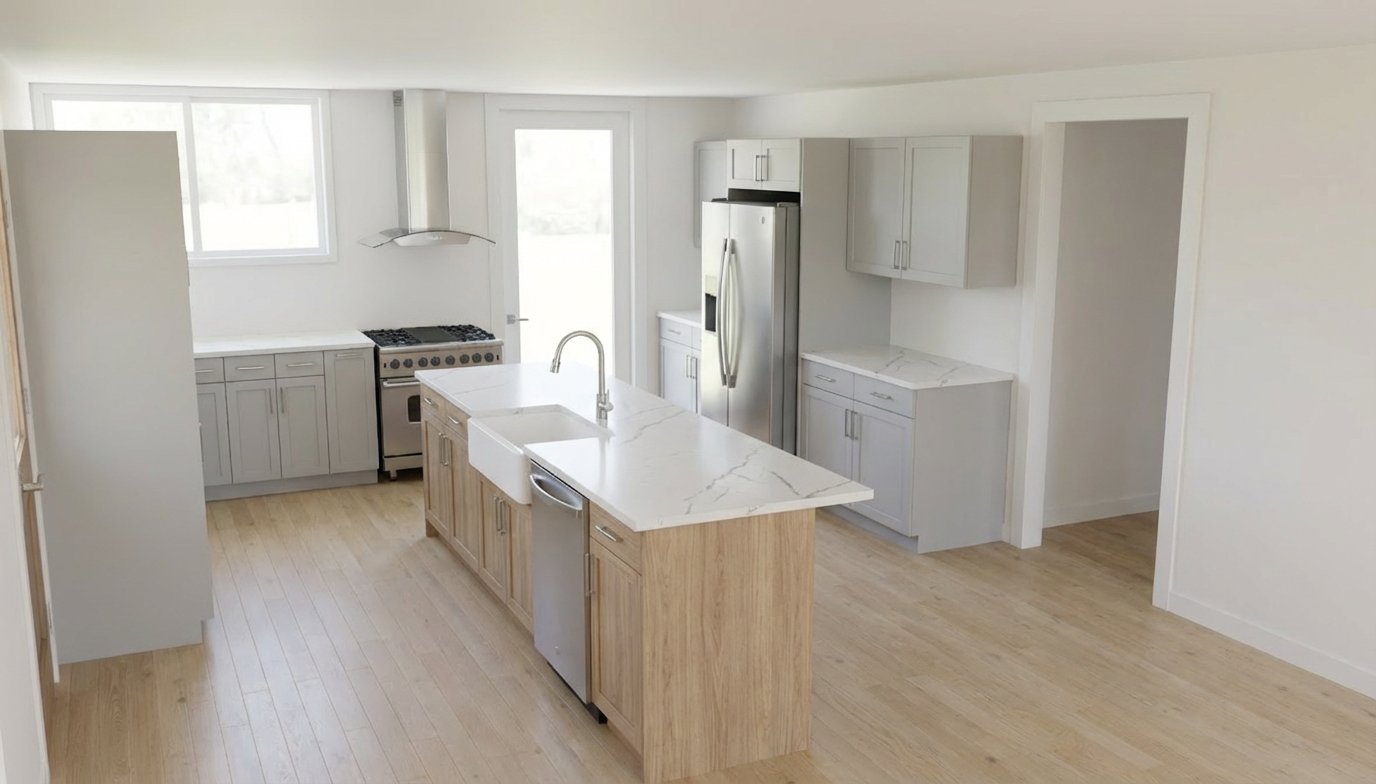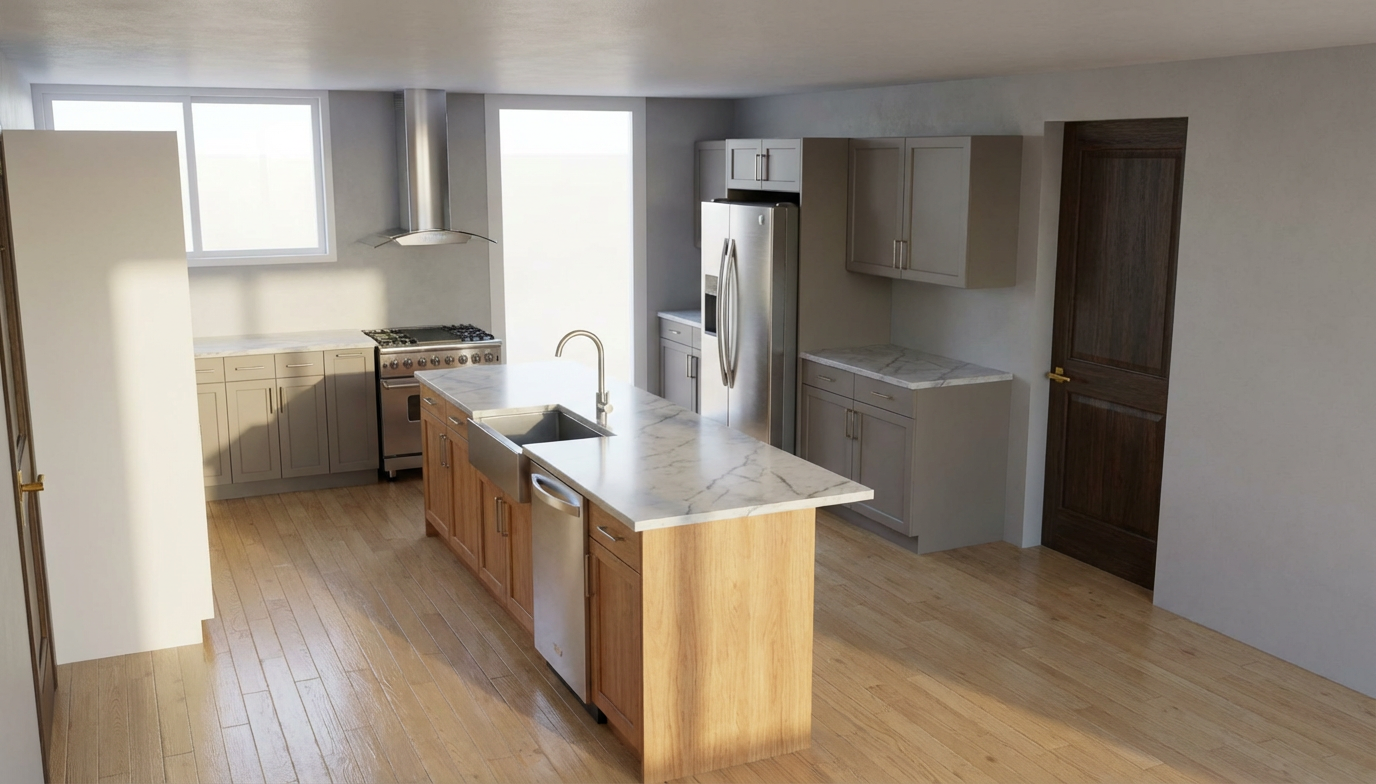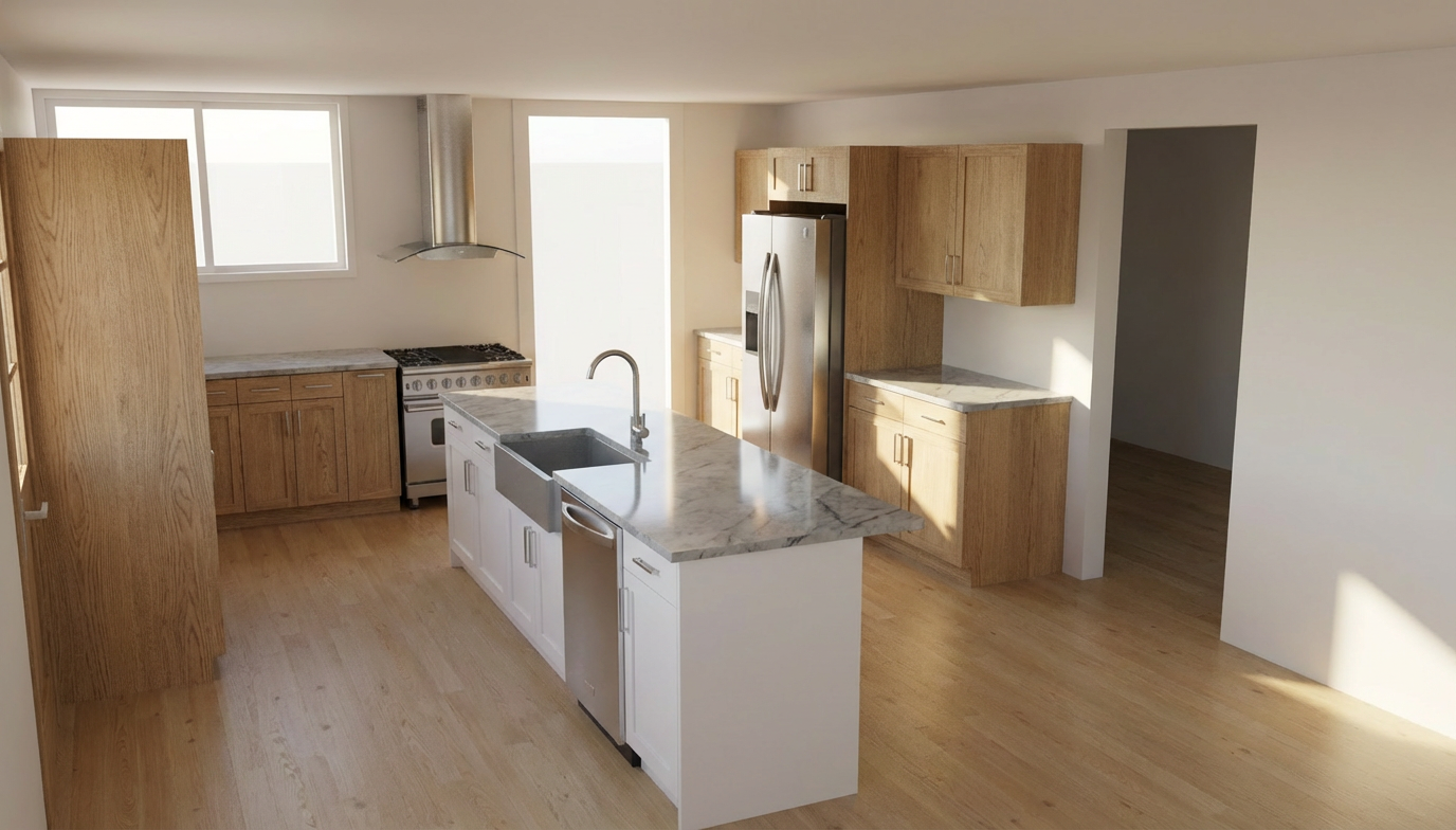 keep all measurements and materials and components the same make look realistic make the all the cabinets in white oak rift cut and the island in white remove shadows and make the oak with finer lines