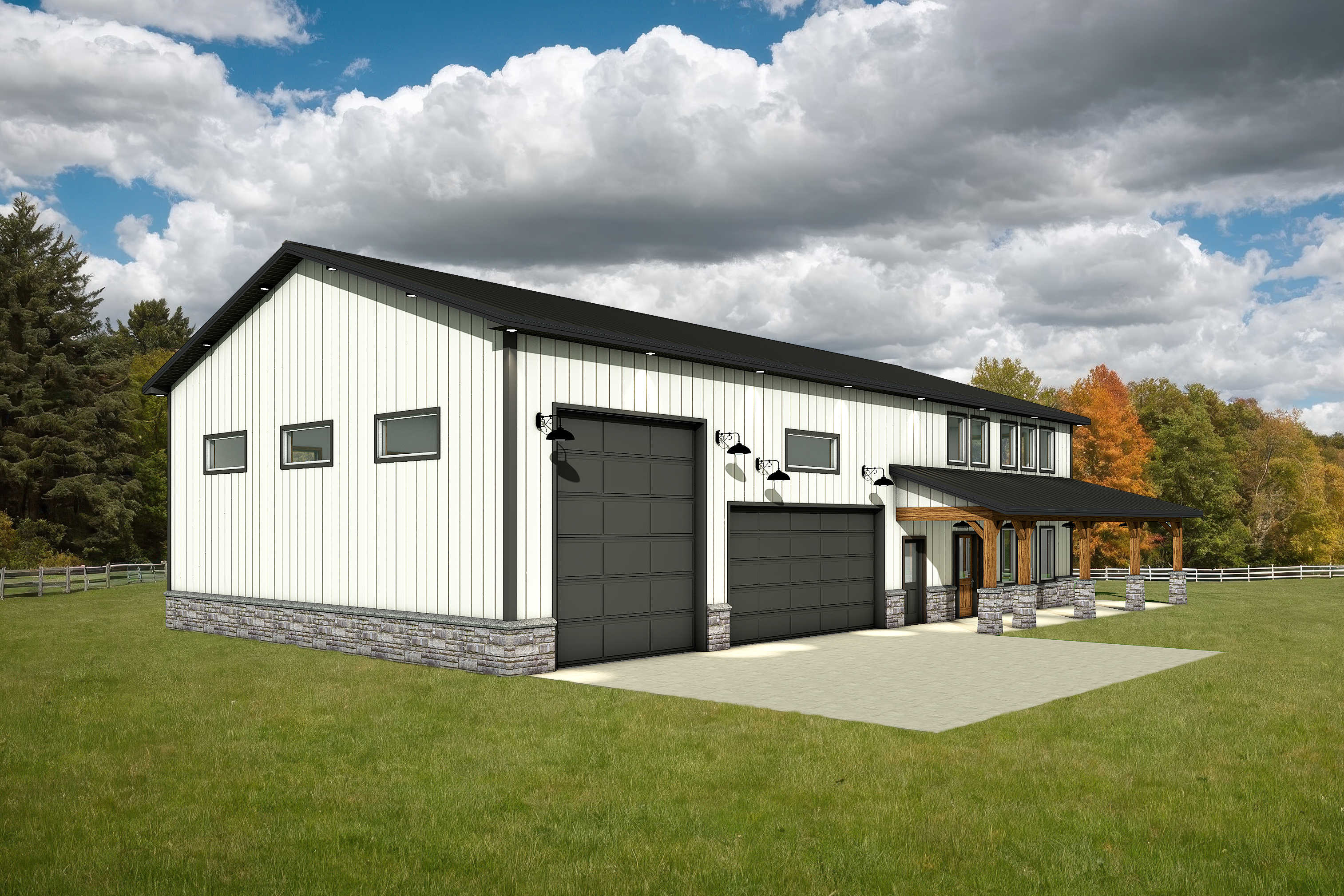 a modern house retain the exact structure metal roof colors and window arrangement rooflines siding foundation height and proportions exactly as shown in the reference image integrate into the terrain there are just a few trees mixed hardwoods that are mostly on the sides of the image add cooler afternoon sunlight subtle dappled highlights across the siding and grass create ultra realistic lighting crisp shadows detailed textures in the siding and glass reflections and an overcast sky show only a few lights visible inside render in hyper realistic architectural visualization quality 8k resolution add a driveway tying into the concrete garage door apron make it the fall season add realistic landscape