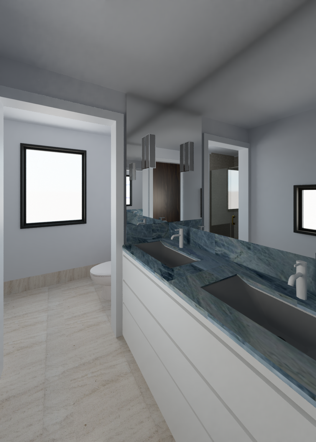 add a tree and sky in the winows add soft ambient lighting add a light gray blue paint colors to the walls vanity