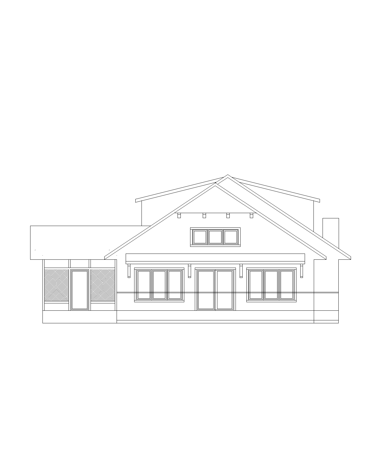 rustic brown wood siding deck on front with black railing black windows and shingles dense trees in background and lake in foreground with a bluff move dormers further back put square window in peak and stone on chimney