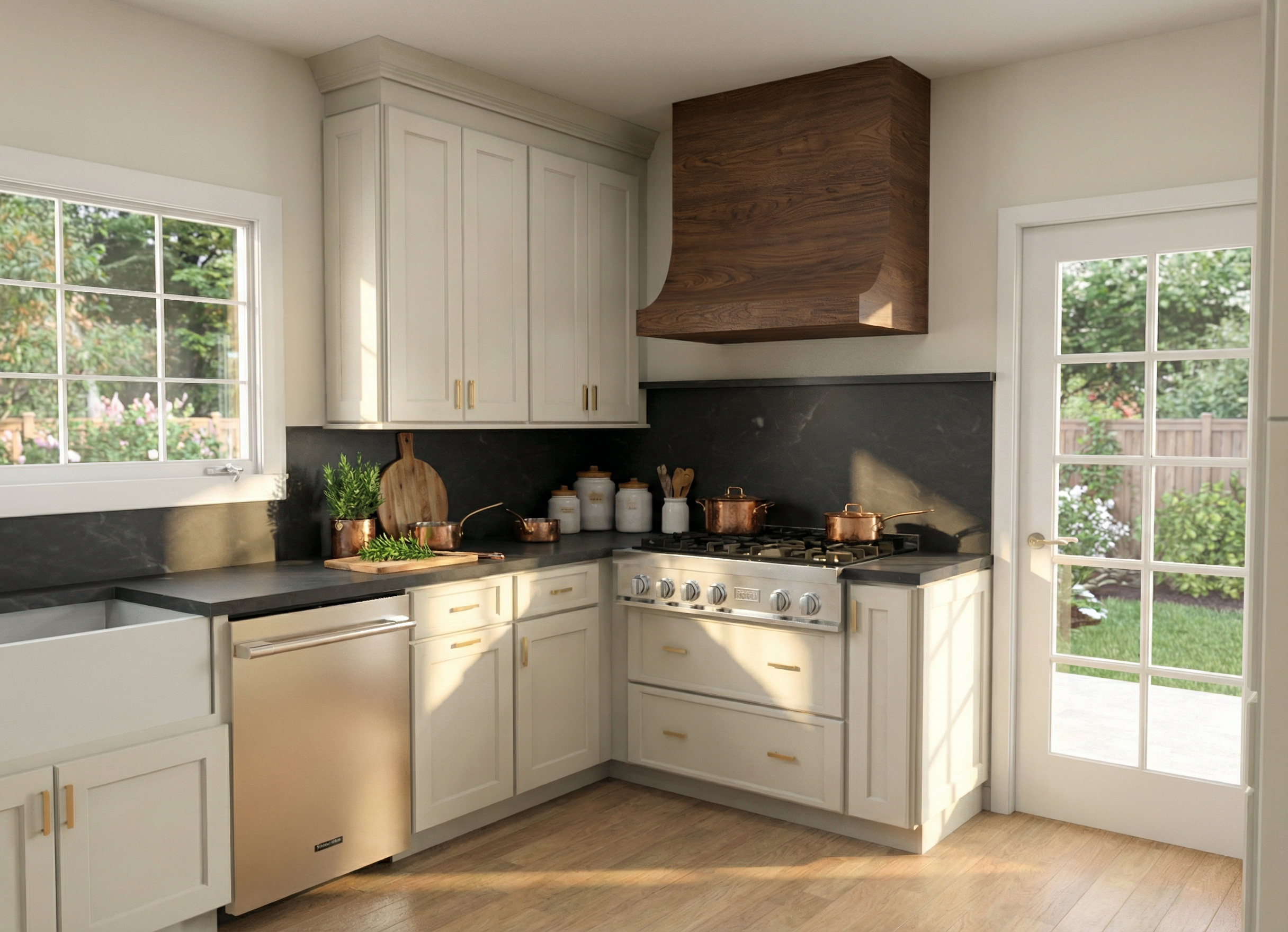isometric top down view of an open air outdoor kitchen inside a modern matte black pergola with visible posts and beams this is not an enclosed structure do not add walls rooms or interior architecture create a clean l shaped outdoor kitchen island made of smooth coastal microcement in a warm white limestone tone the island should feel sculptural and built in not like cabinetry layout must follow this hierarchy main run horizontal 13 14 ft long keep this run clean and not crowded center a 5 ft grill provide generous landing space on both sides of the grill place a double gas burner to the right of the grill with spacing place a sink and integrated trash at the far right end do not add a pizza oven on this run return leg vertical 10 12 ft long center a pizza oven as the focal point provide symmetrical counter space on both sides optional open niche shelving below this leg should feel more architectural and less appliance heavy secondary element add a long narrow prep and seating surface parallel to the main run approximately 8 10 ft long and 30 36 inches deep minimal thickness same microcement material structure placement keep all elements fully inside pergola posts maintain clear circulation space around the island leave the left side open as a walkway material style smooth microcement or plaster finish thick slab edges 3 4 inch visual weight soft organic coastal mediterranean aesthetic minimal visible stainless steel integrated appliances not bulky floor existing poured concrete slab soft gray tone slightly imperfect matte finish no tile pattern important do not overcrowd the main run do not add additional kitchen zones do not place appliances randomly keep the composition balanced and minimal