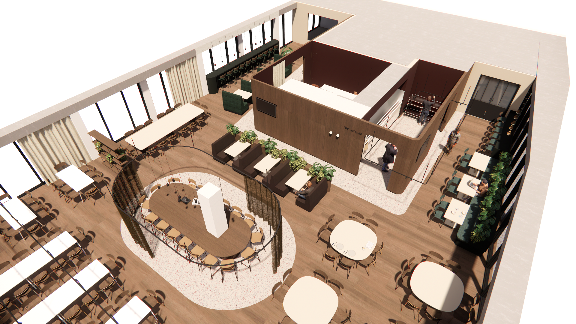 render an top view office cafetaria interior use earthy tones for the wooden floors and tables the chairs are wallnut wood the walls are painted in soft cream complementing the light curtains the overall ambiance should feel welcoming and stylish