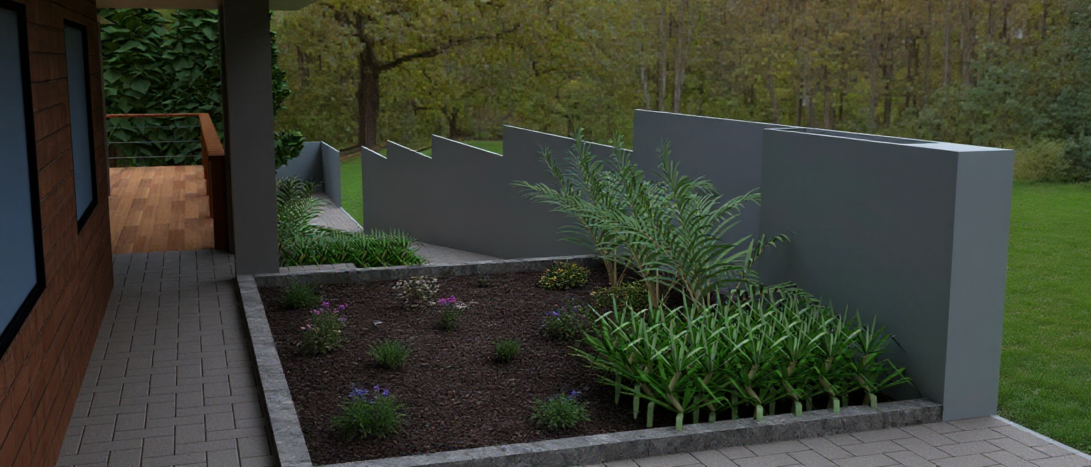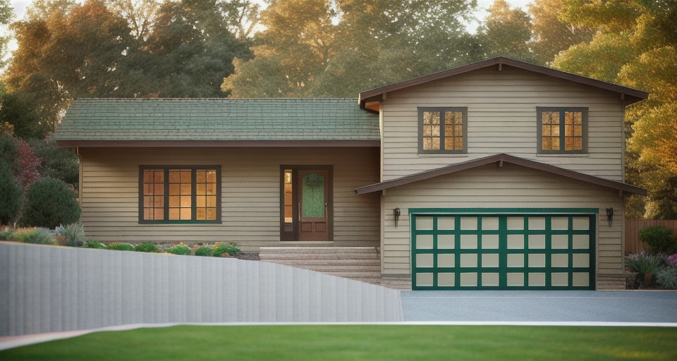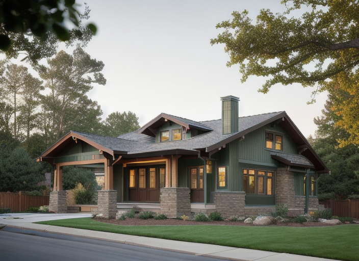 craftsman tyle house with brown walls green windows modest landscaping driveway in front of garage doors rending style watercolor sketch architecture