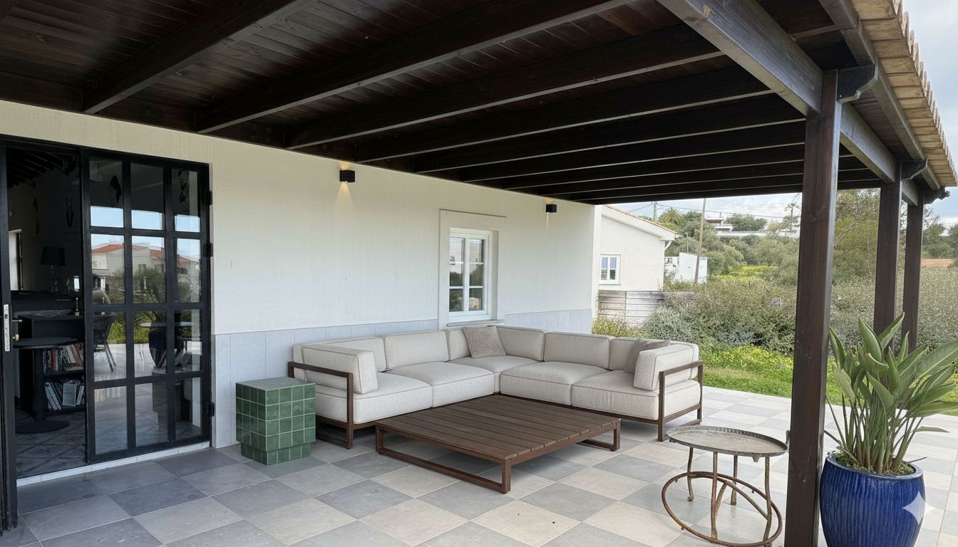a ade la alfombra ten en cuenta que los sofas miden en total 3 x 3 y la alfombra 2x3 ademas quiero que elimines la maceta y la mesita redonda que hay delante del pilar de madera