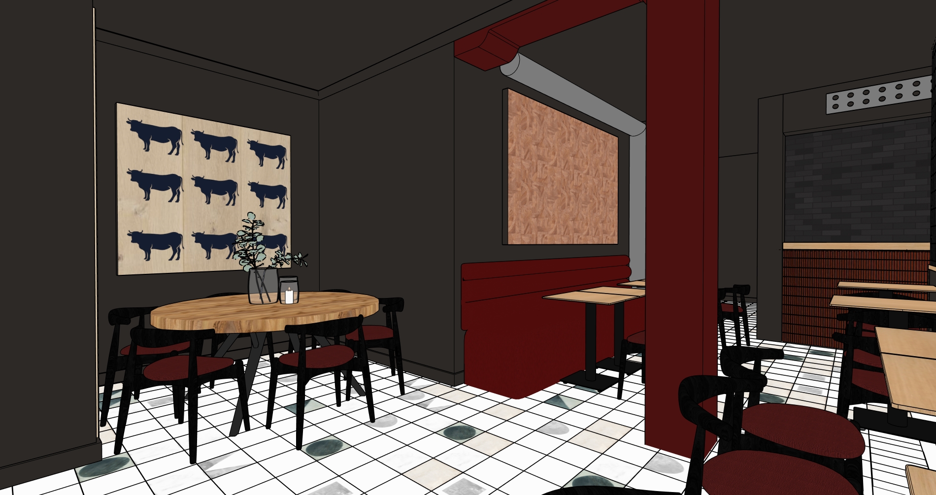 crea una imagen fotorealista de esta sketchup realza las texturas el tubo gris es un conducto de aire hace una l desde el suelo