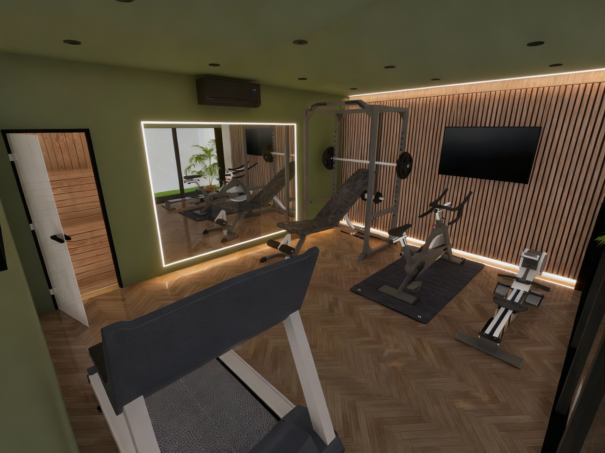 walls and ceiling finish all walls and the ceiling in ral 6009 fir green ceiling is smooth non slatted and slopes downward from front to back mirror lighting mandatory install warm white led strip lighting recessed into an aluminium channel around the full perimeter of the mirror lighting must be continuous and clearly visible slatted feature wall only slatted element in the room vertical timber slats only slats must be thin narrow no slats on the ceiling or any other surface slatted panel geometry top edge of slatted panel is perfectly level upper gap between slatted panel and ceiling is a painted ral 6009 surface not timber upper gap size 30 mm at the back increasing slightly toward the front due to ceiling slope bottom gap between slatted panel and floor is 100 mm painted ral 6009 feature wall led lighting install warm white led lighting recessed into an aluminium channel directly above the slatted panel fixed to the underside of the painted upper gap install warm white led lighting recessed into an aluminium channel directly below the slatted panel fixed to the underside of the slatted panel led lighting must wash the slatted surface do not place led lighting on the floor prohibitions no slatted ceiling no timber in the upper or lower gap areas do not omit relocate or floor mount any led lighting