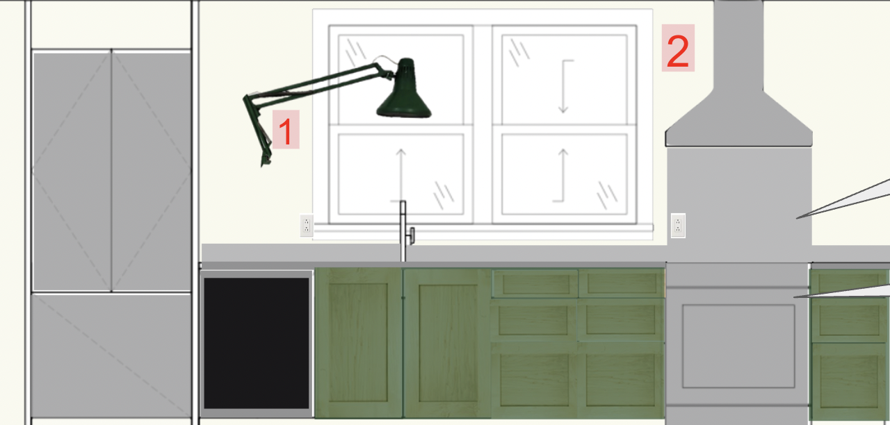render this walls soft white stainless backsplash and counter tops stained dark green cabinets with grain showing take away the numbers and make the task light brown