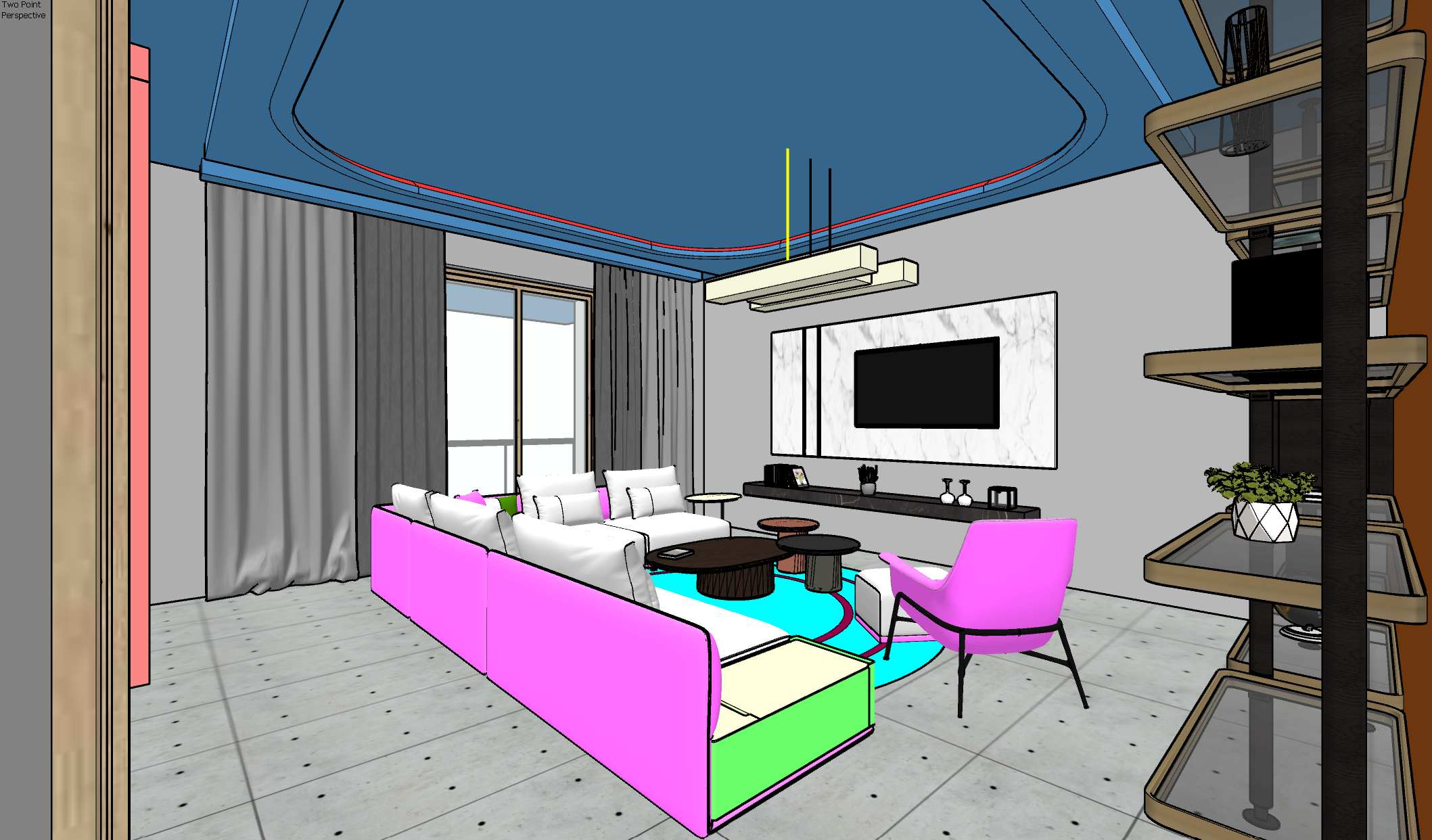 interior shot a hyperrealistic interior rendering of a bold modern living room within a high end apartment the image must preserve the exact layout proportions and geometry of the reference floor plan including furniture placement window positions and spatial zoning design style italian minimalism fused with architectural bravery sculptural simplicity curated materials precise lighting architectural features to include curved or floating ceilings with hidden ambient lighting led or cove style a soft transition between wall and ceiling creating sculptural continuity built in furniture elements tv wall shelving hidden storage material palette neutral but layered tones soft beige ivory taupe walnut matte charcoal textures brushed stone microcement soft wool or boucle upholstery natural oak matte lacquered surfaces daylight ambiance natural sunlight from large windows filtered through sheer curtains add photorealistic shadows and light bounce across floor and furniture signs of life a cashmere throw on the sofa elegant coffee table books ceramic vases a remote control scented candle and one subtly misplaced cushion for realism composition balanced calm and monumental as if photographed for an international design magazine no human figures no clutter maximize material and light realism