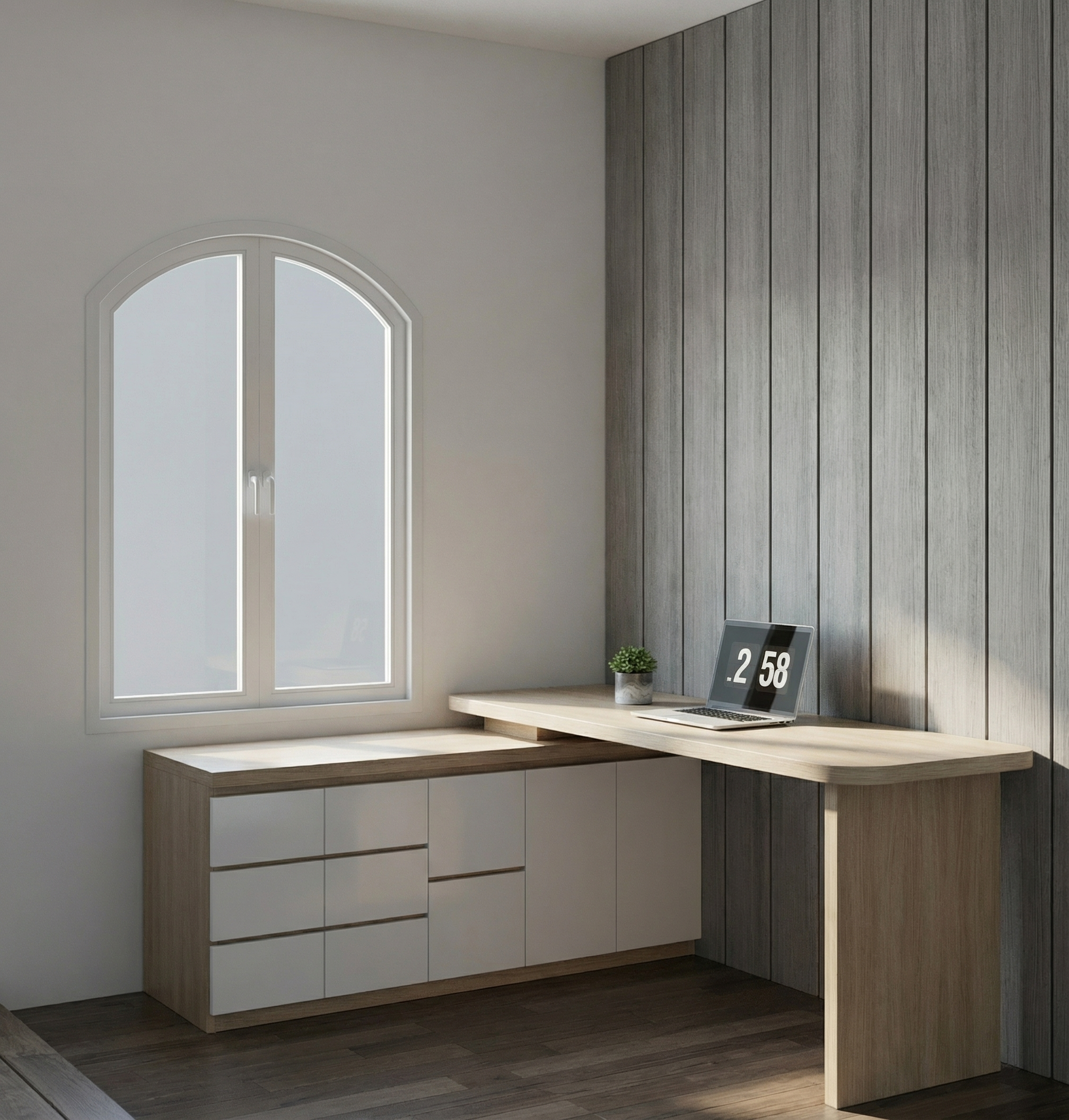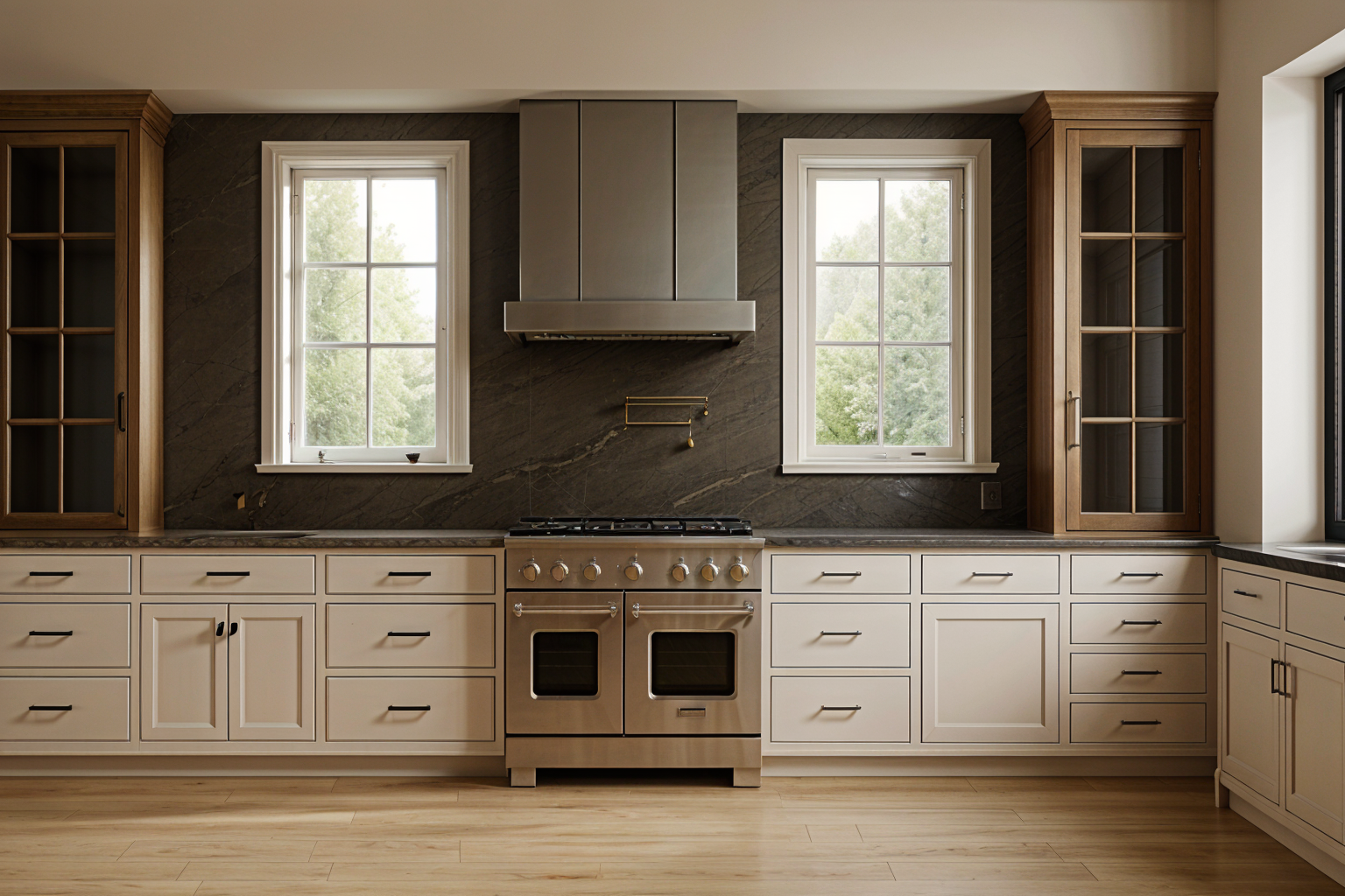 a modern spanish style kitchen with soft ambient lighting white oak cabinetry oiled brass fixtures