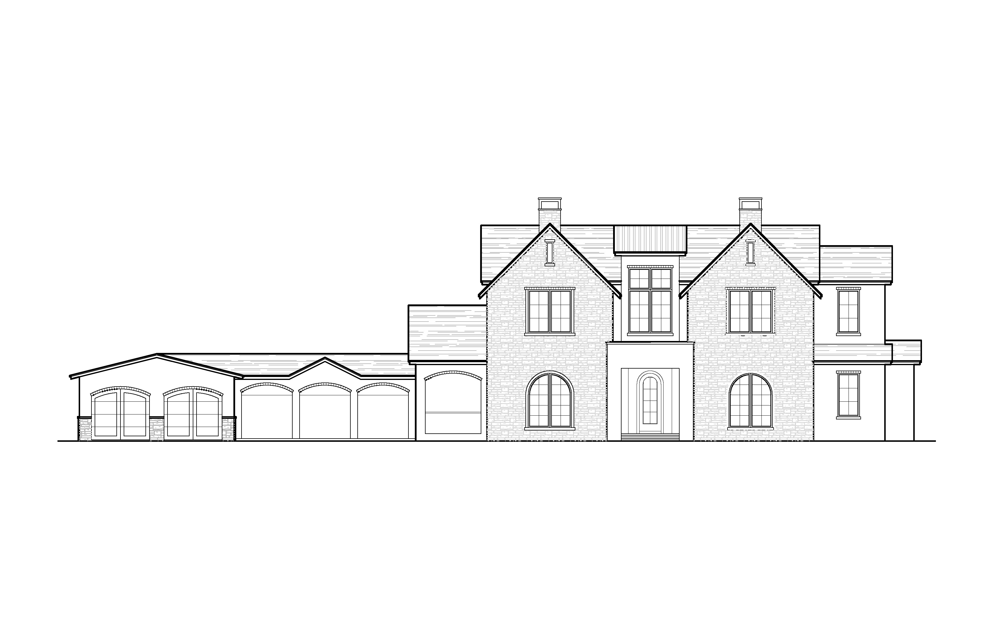 modern french style elevation light neutral colors light stone bronze windows metal roof accent over entry carriage garage doors heavy landscaping and large trees in the background