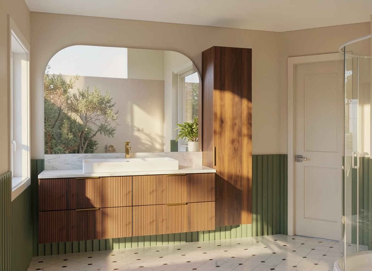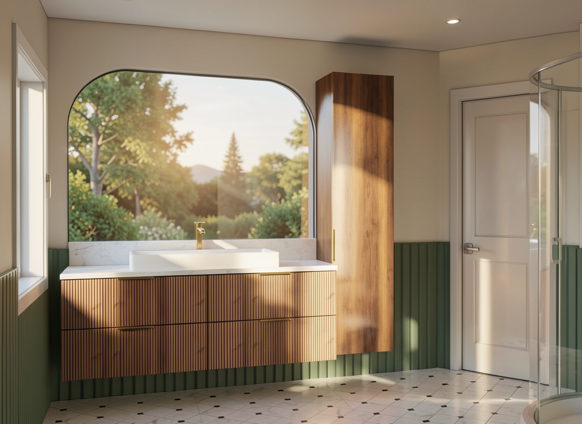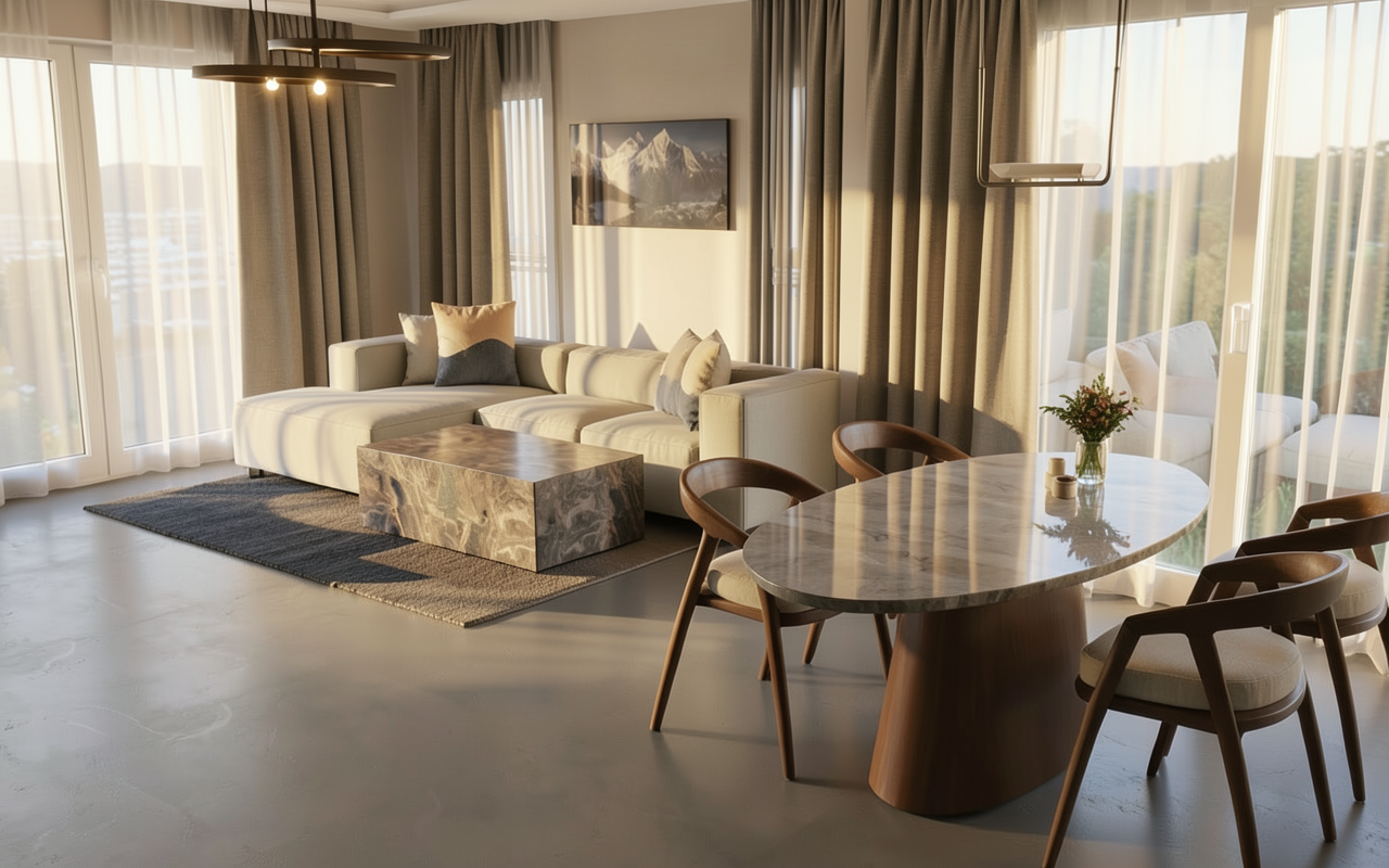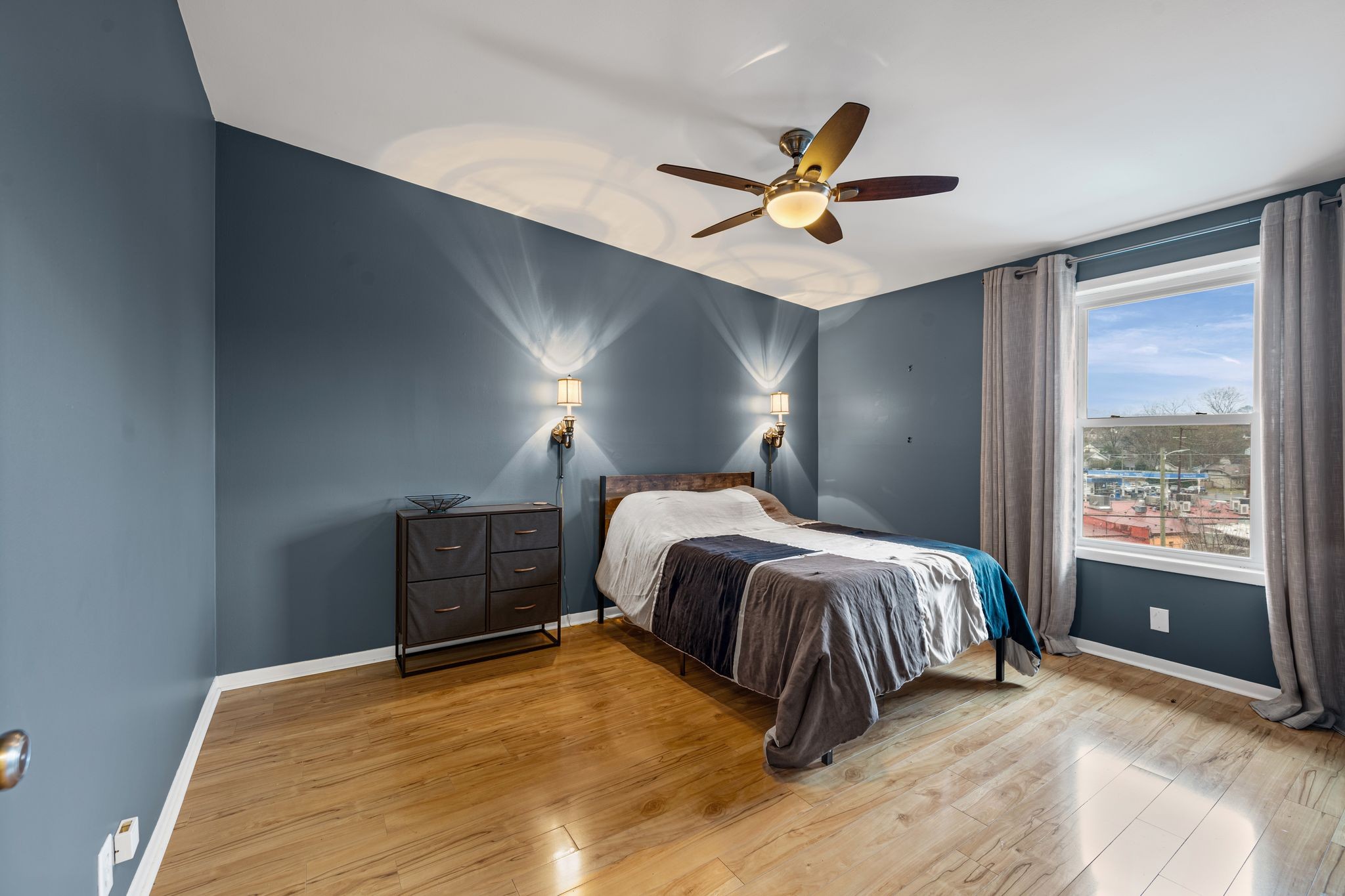 contemporary interior shot make a contemporary realistic image from this photo make the bedding a contemporary neutral color add a neutral wallpaper to the back wall paint the walls white update the ceiling fan to a newer contemporary style update the curtains change the nightstands to a contemporary style and the sconces center the bed on the back wall add another night stand to either side of the bed with the sconces centered above the nightstands add a neutral rug underneath the bed architecture
