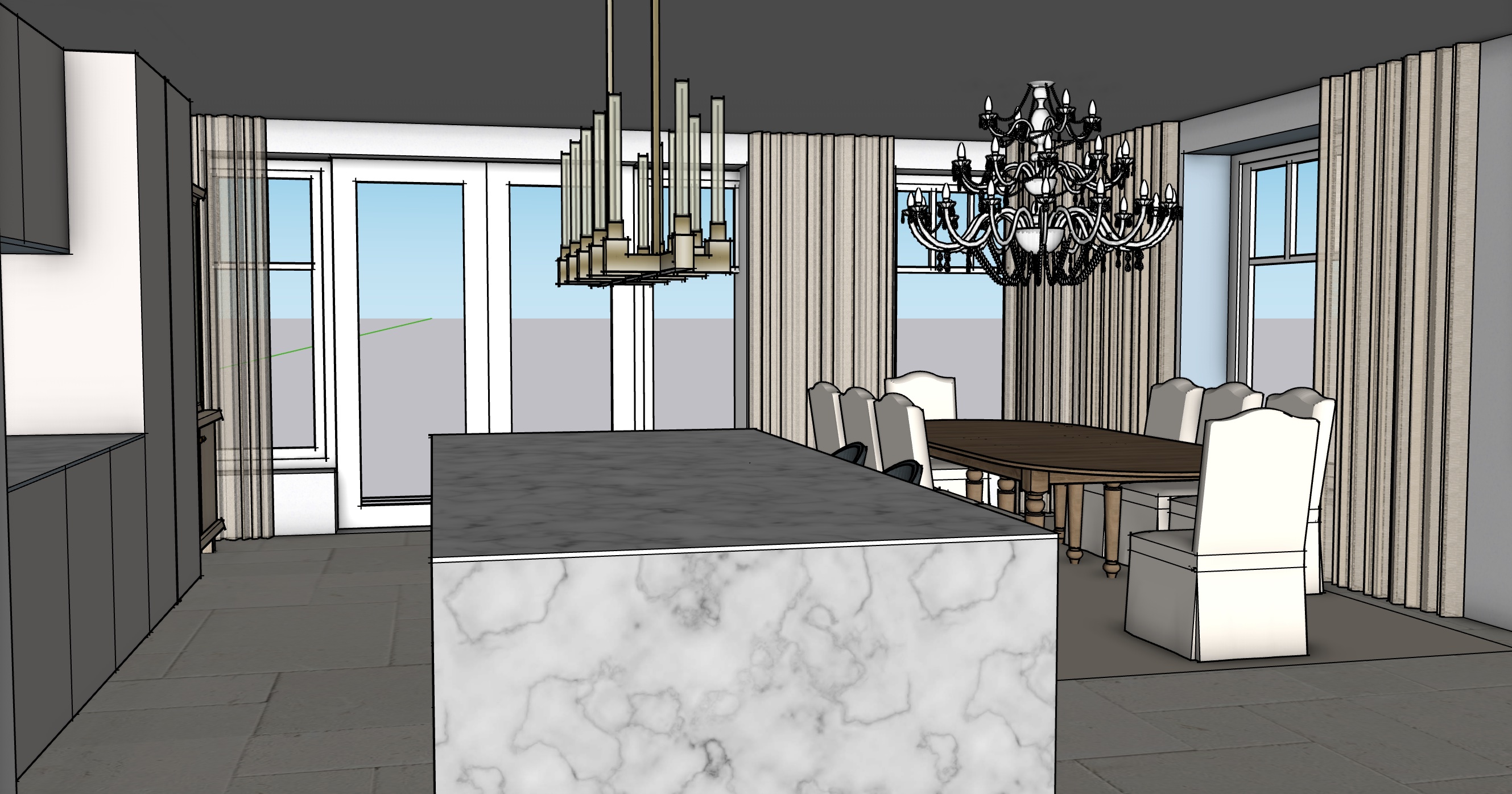 contemporary interior shot restoration hardware marble kitchen island chandeliers limestone floor farmhouse style rustic windows on garden wood architecture
