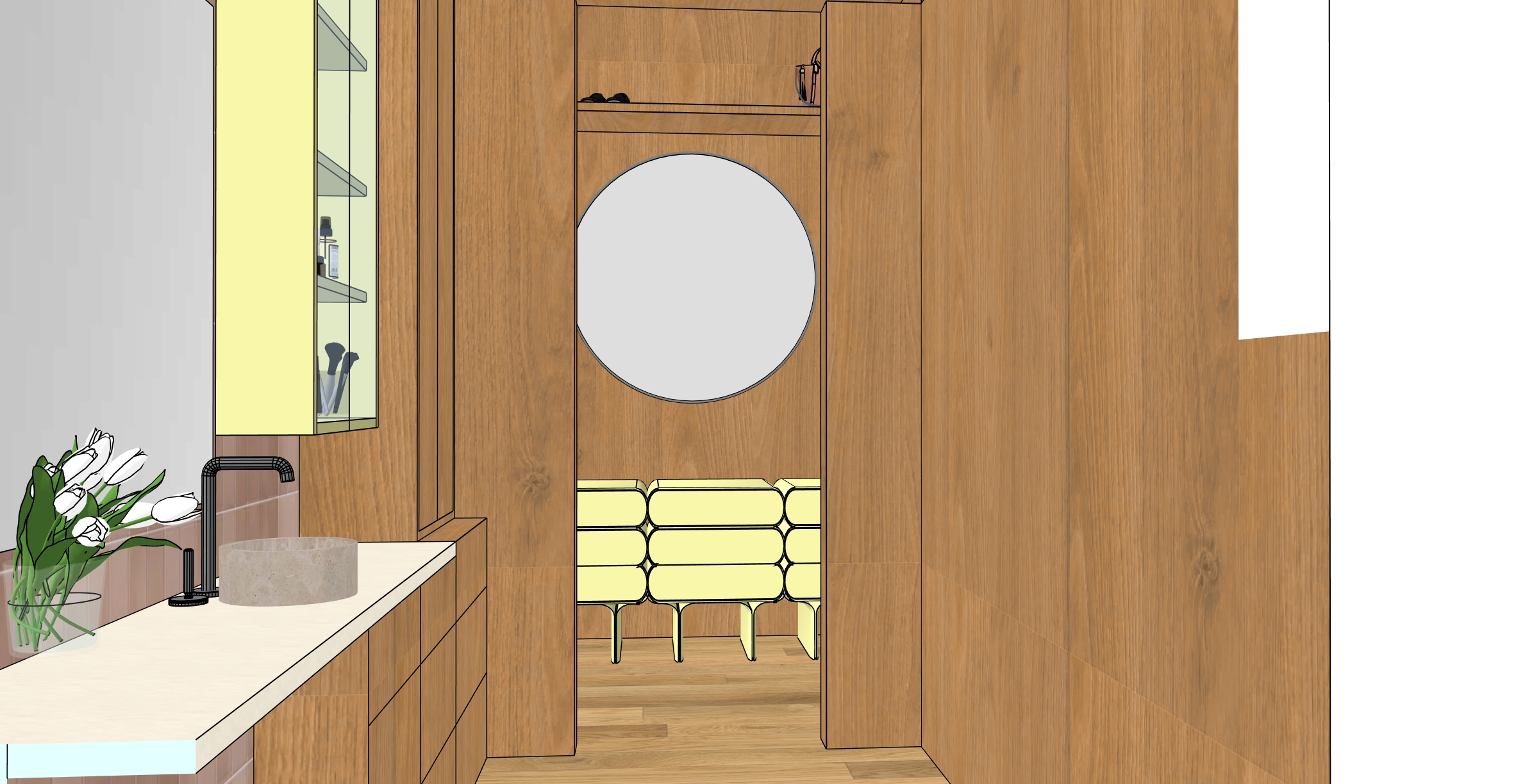 make woods white oak finish make the cabinet in the back under the round mirror more glossy
