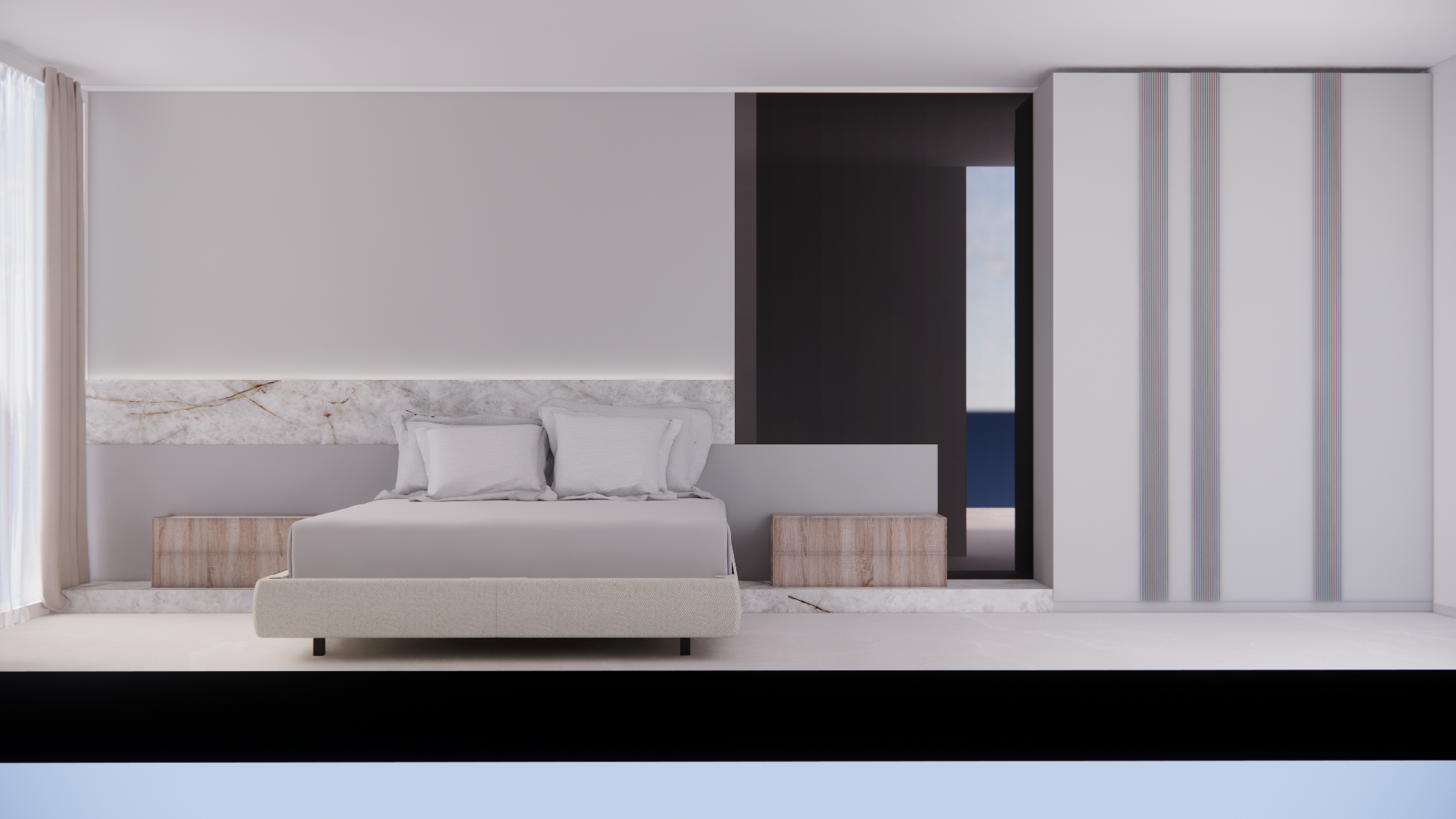 transform this image into a photorealistic interior photograph keep the exact geometry composition camera angle and design do not modify layout or furniture improve realism with the following lighting use soft natural daylight coming from the left window realistic sun direction add subtle ambient bounce light and soft shadows avoid overexposure and artificial glow materials apply highly realistic textures with imperfections fabric bed upholstery with visible weave and slight wrinkles linen curtains with translucency and natural folds wood nightstands with real grain variation and slight wear marble with depth subtle reflections and natural veining variation painted walls with very slight texture not flat details add small imperfections slight asymmetry in pillows natural fabric creases micro scratches on surfaces add subtle reflections and contact shadows ao ensure realistic scale of all elements camera render use realistic camera settings full frame 35mm lens depth of field very subtle almost sharp everywhere high dynamic range balanced contrast post processing slight film grain natural color grading warm neutral tones no cgi look no excessive sharpness style high end interior photography similar to architectural photography magazines important do not redesign anything only enhance realism