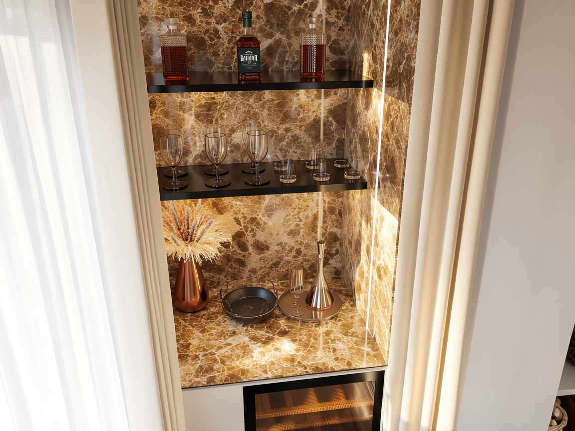 high end architectural visualization of the rear facade of a modern barn villa based on the provided geometry the large central chimney and left accent wall are made of rough cut natural beige stone the side wings feature vertical light oak wooden cladding all window frames the prominent supporting pillar on the right and the roof edges are finished in matte anthracite metal floor to ceiling glass windows with a warm interior glow and subtle reflections of the garden the villa is situated on a sleek grey stone terrace surrounded by a lush green lawn architectural hedges and gravel paths lighting soft golden hour sunlight creating depth and highlighting the textures of the stone and wood photorealistic 8k serene luxury atmosphere