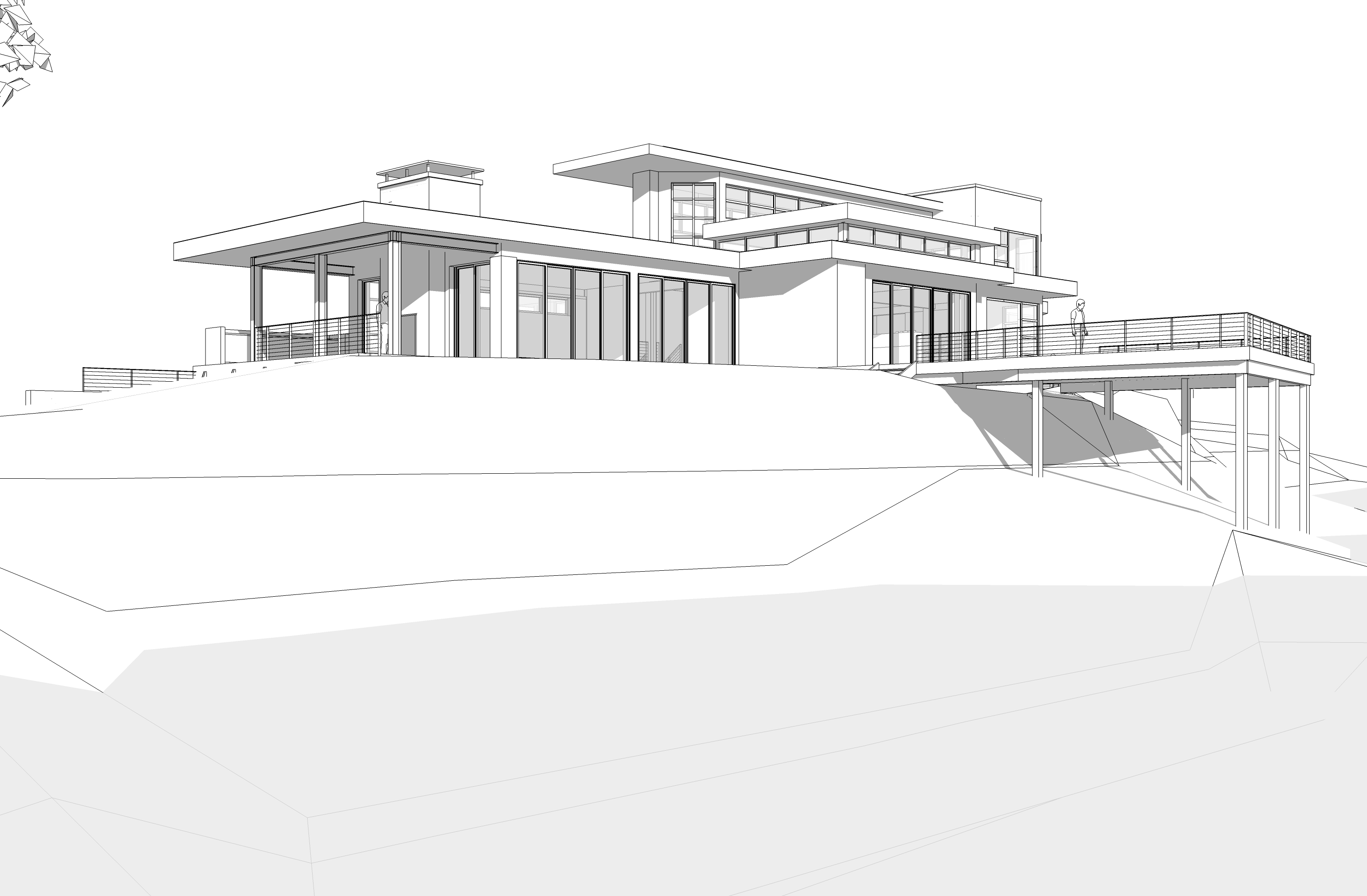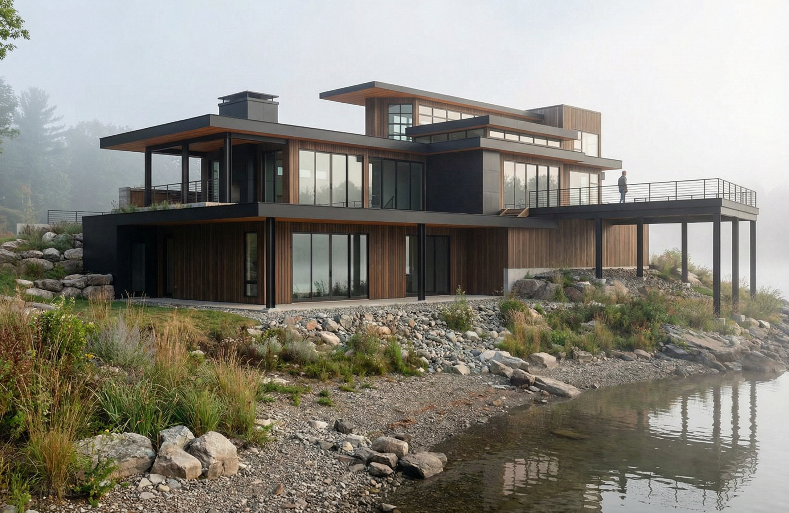 industrial home design vertical wood siding wood ceiling matte black fascia matte black steel panel accent walls lake shoreline foreground fog