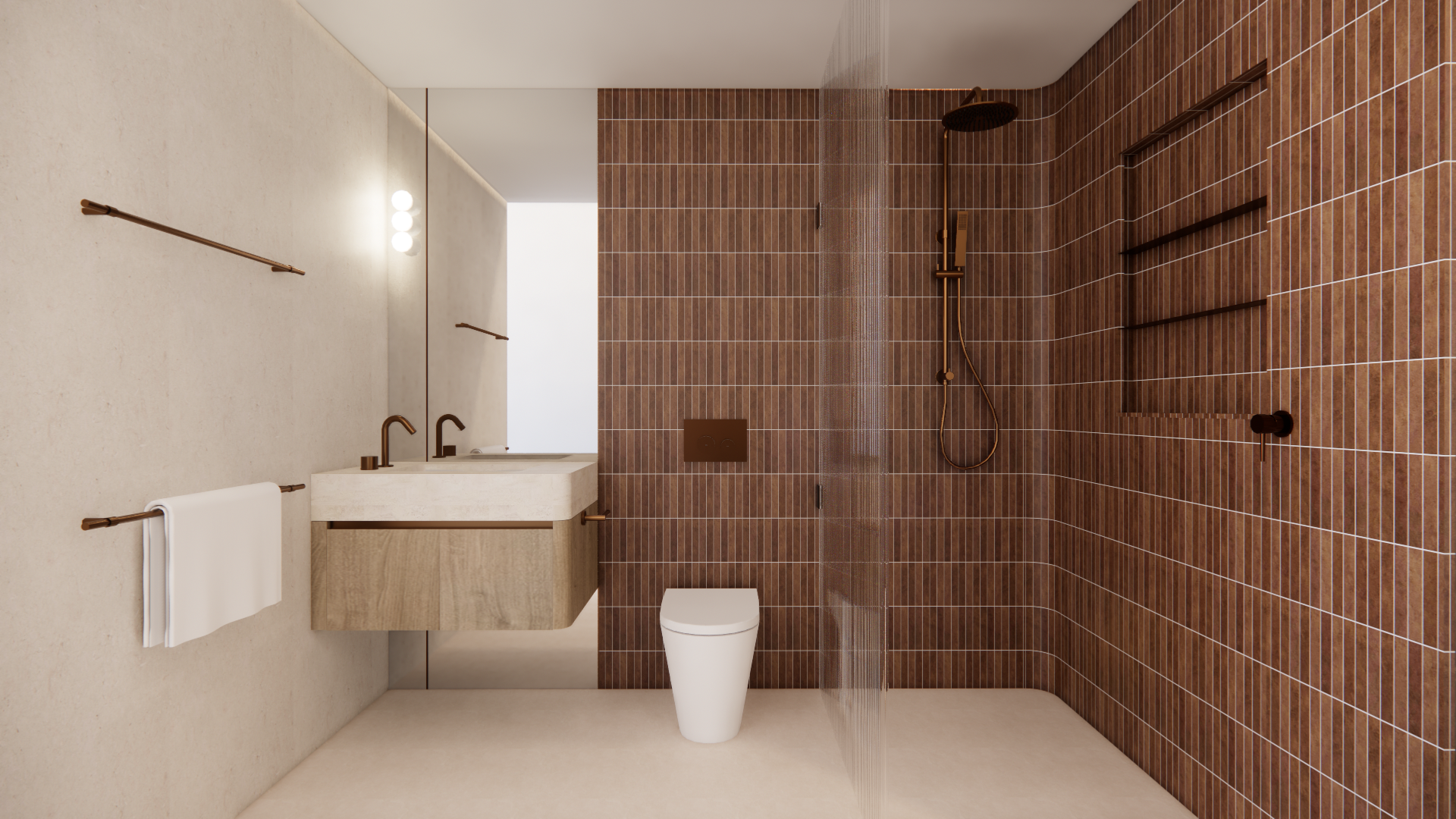 add bathroom items to the right hand side where the shelving is on the right wall replace the towel that is on the towel rail on the left with a rusty brown coloured one that looks realistic
