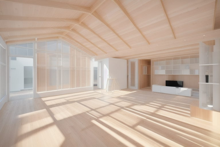 modern interior living room tongue and groove ceiling panelling light wood floors pool outside on right architecture