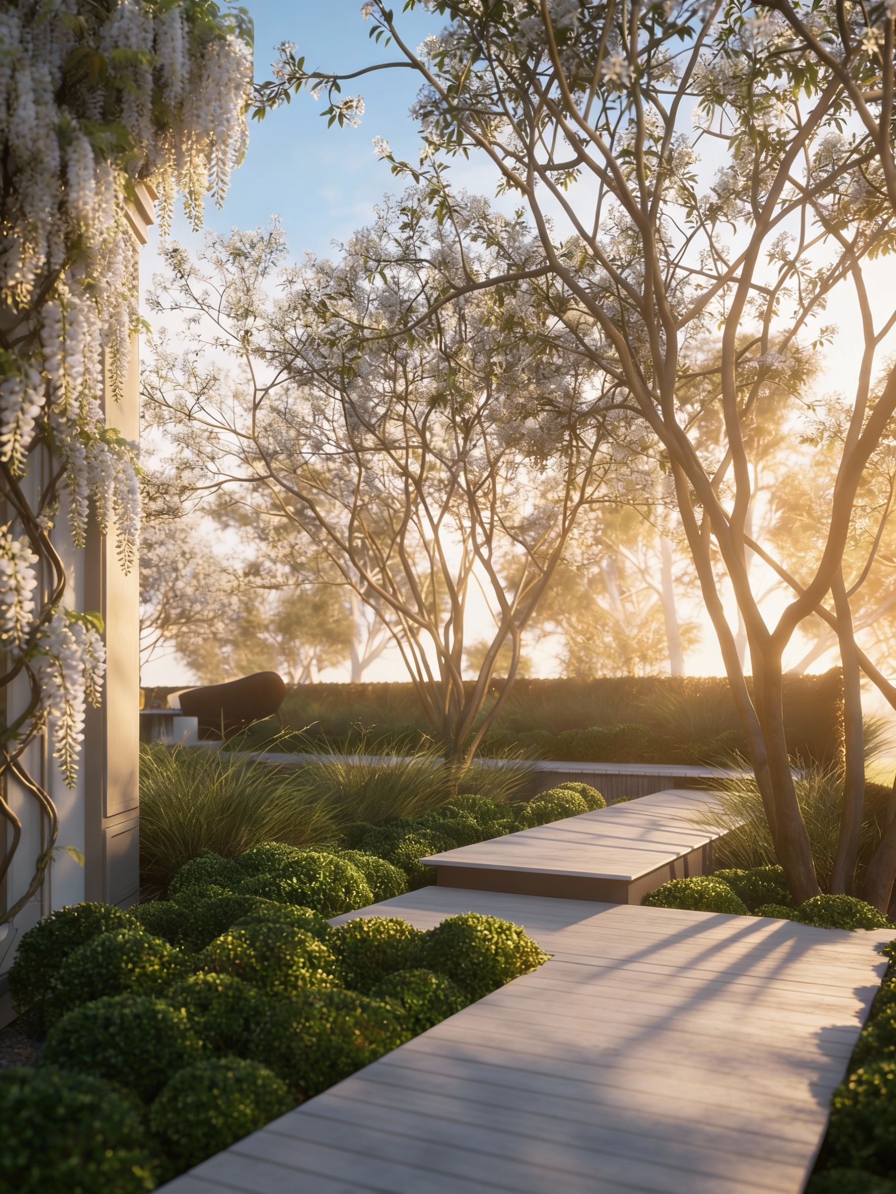 render into real image and keep it composition same make it blend vegetation with environment soft dawn light ambience fix the white wisteria vines to be more natural