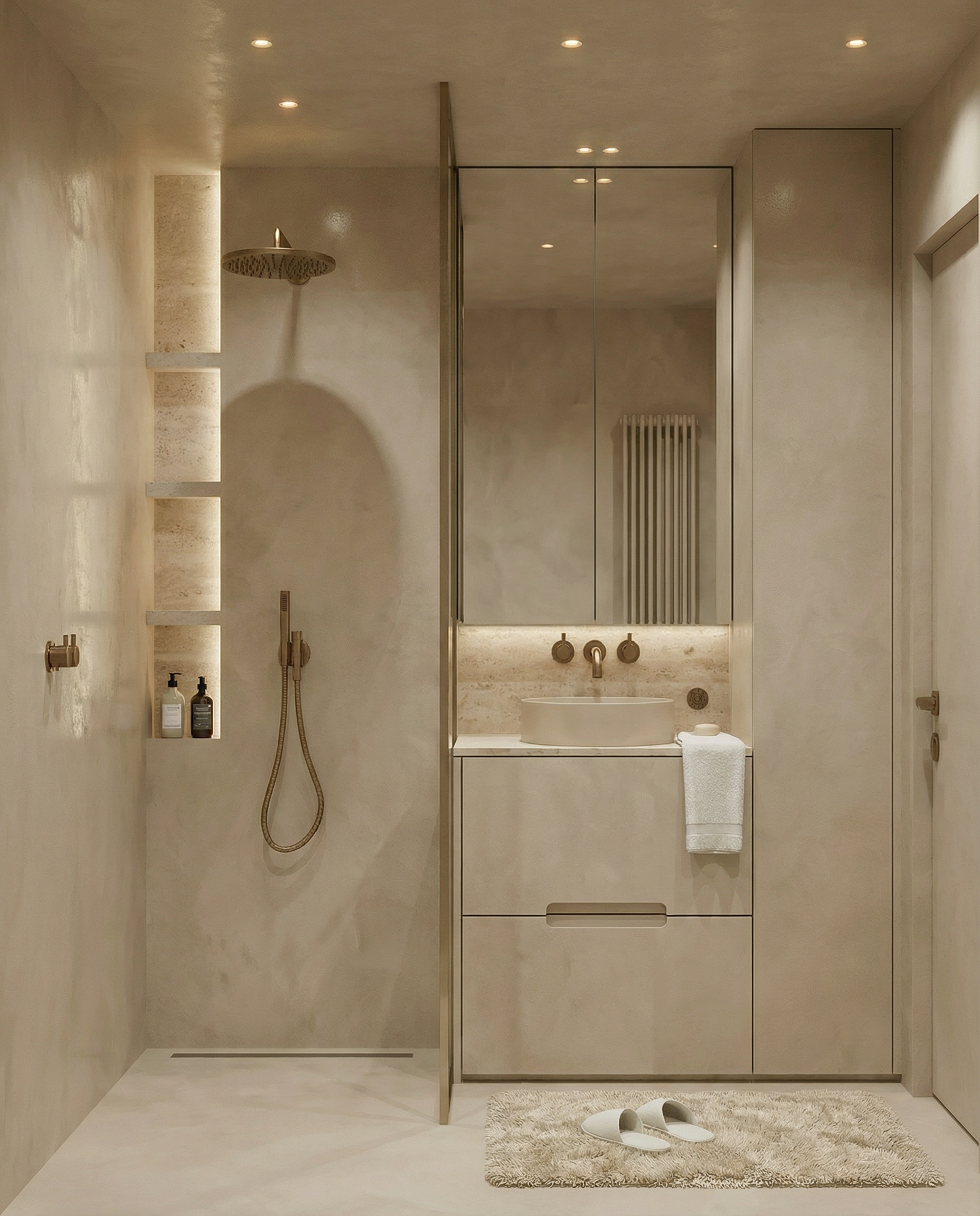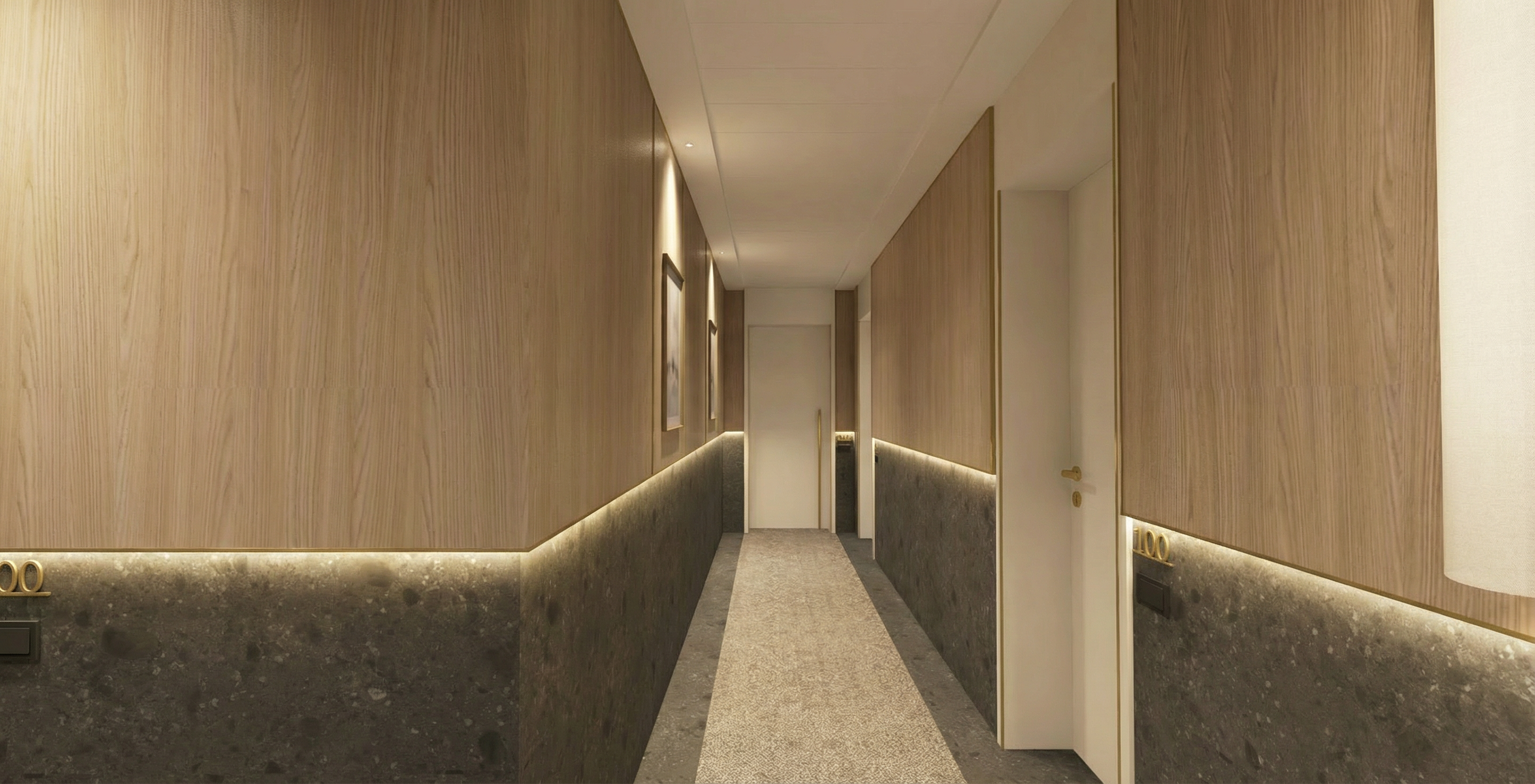transform the scene into a highly photorealistic interior with physically accurate materials realistic lighting shadows and reflections so it looks like professional architectural interior photography not cgi archsynth 2 replace any flat or generic floors with realistic hotel flooring large format porcelain or natural stone tiles in circulation zones and soft dense wool or nylon carpet in rooms and corridors with visible texture and subtle variation upgrade walls to high quality paint or refined wall panels in neutral warm tones with precise edges discreet shadow gaps and realistic baseboards in painted mdf or brushed metal avoiding plastic looking finishes glamorous design 1 apply convincing materials to all furniture and built ins natural oak or walnut veneer with visible wood grain matte lacquered fronts upholstered elements in textured fabrics leather or faux leather headboards realistic glass and metal details in brushed brass black steel or stainless steel with proper reflections micro scratches and soft highlights archsynth 1 improve lighting realism by combining soft diffused daylight from windows with warm artificial lighting typical for hotels ceiling downlights concealed led coves bedside lamps floor lamps and decorative pendants all with warm white color temperature around 2700 3000k create balanced even light without burnt highlights using global illumination soft contact shadows and gentle falloff into darker zones as in high end interior photography alconlighting 2 refine shadows and contrast so that every object has clear but soft shadows consistent with the light direction improving depth and realism enhance reflections on glass polished stone metal fixtures and tv screens so they are subtle and physically plausible avoiding mirror like overly strong or noisy reflections archsynth 1 add hotel appropriate furniture and equipment according to the function of each room without changing the layout for guest rooms bed with headboard bedside tables reading lamps desk with chair armchair or small sofa luggage bench wardrobe tv curtains and sheer drapes decorative cushions and a throw minimal artwork on the wall include subtle styling neatly arranged bedding a few books a tray with glasses or a coffee set a vase with simple greenery and carefully placed cushions always avoiding clutter or excessive decoration use neutral timeless color palettes with a few accent colors to keep the space feeling contemporary calm and suitable for a modern hotel glamorous design 1 render in a high end architectural photography style correct verticals realistic lens field of view slight depth of field where appropriate controlled contrast no hdr looking halos and natural color balance final output should be ultra realistic high detail soft natural light professional interior photography style suitable for premium hotel marketing visuals