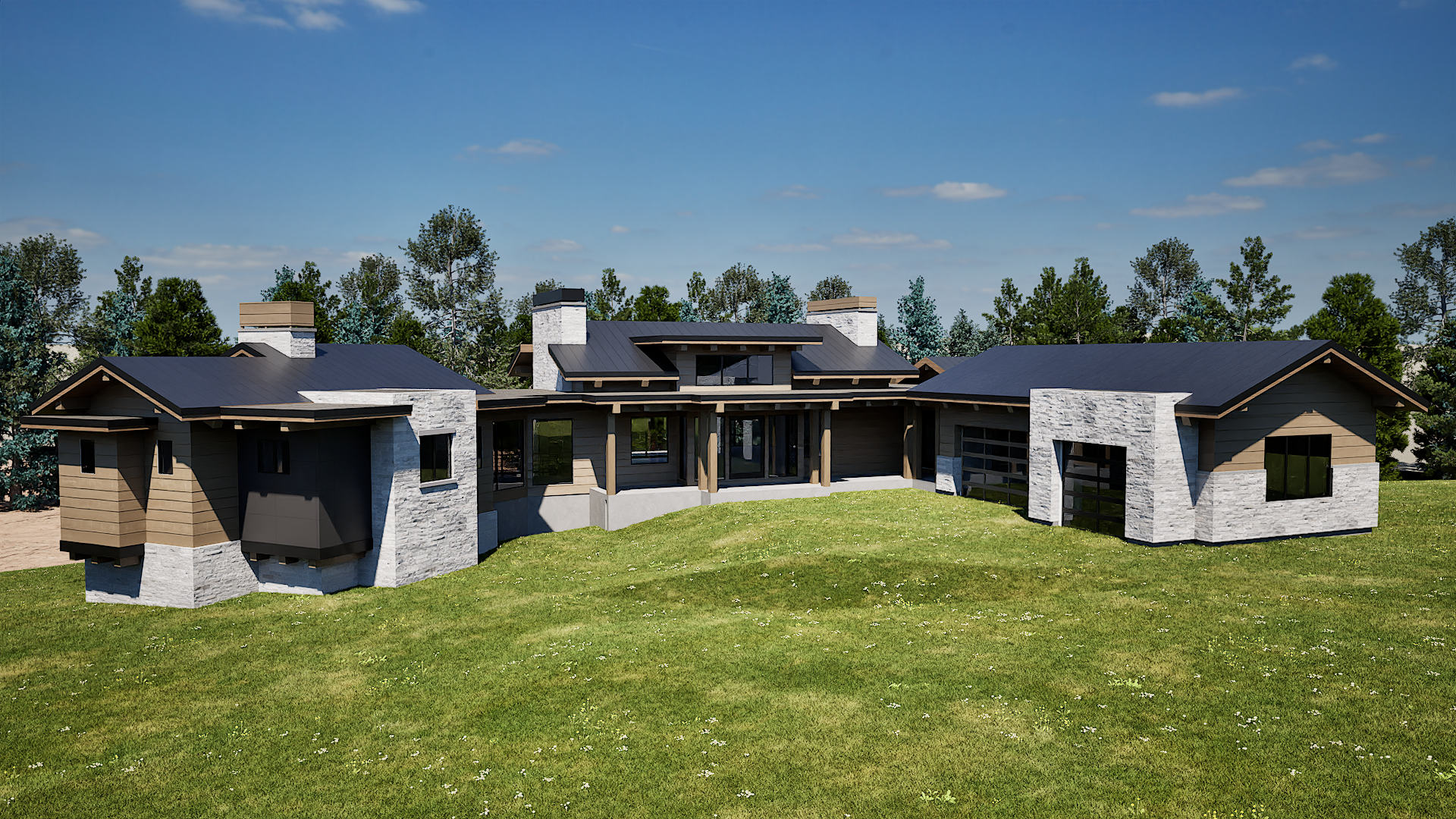 don t change the structure i want the environment to be a warm sunny day with a few clouds i want more vegetation in the background and more landscaping around the exterior of the house add lights illuminating from the windows make the exterior materials feel more realistic and natural