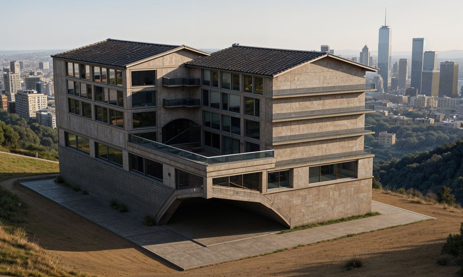 the weather is sunny and the front facade of the building is lit by the sun