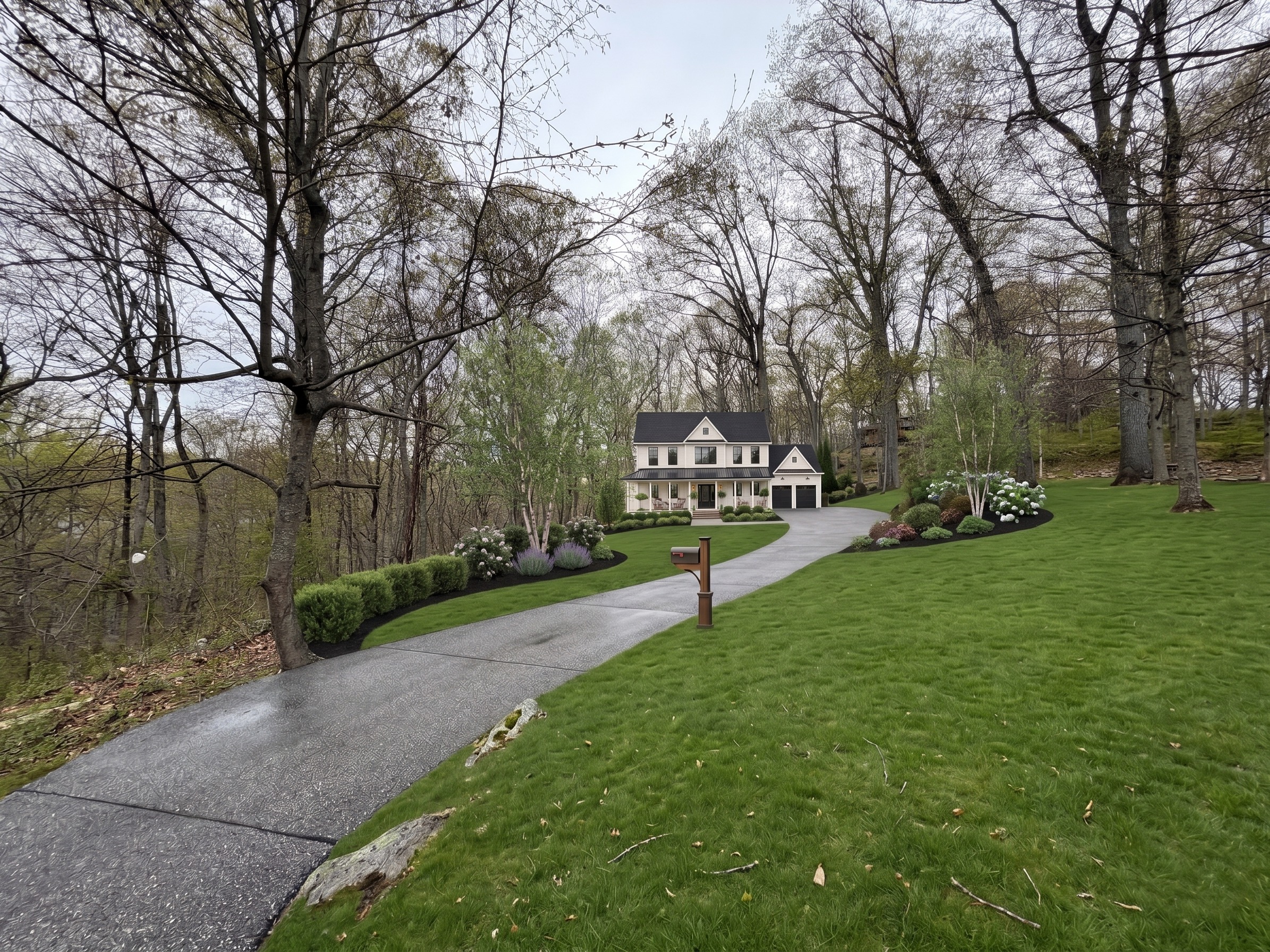 remove the mailbox and make the driveway blacktop change the sky to a sunny summer day